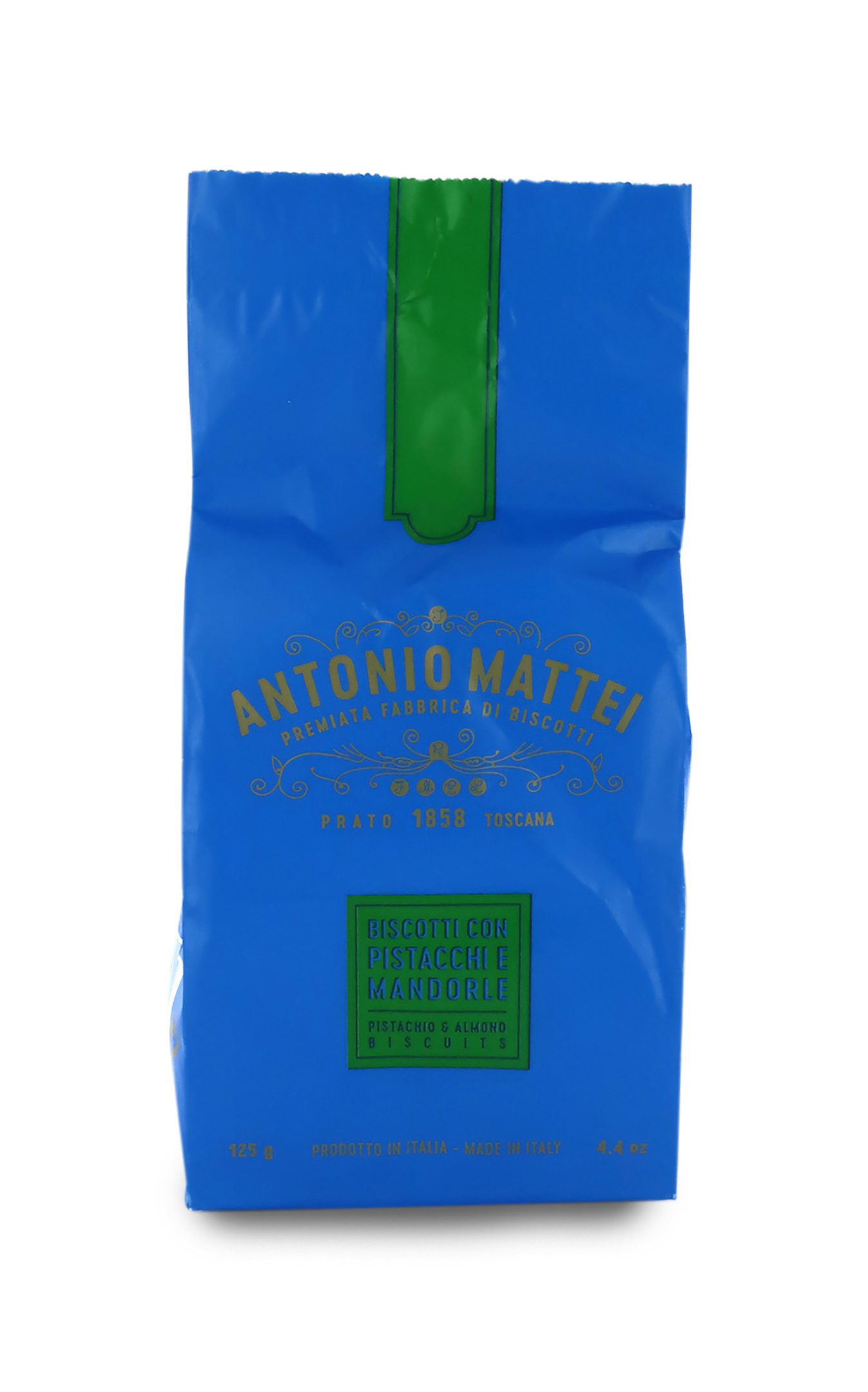 Nel 2017, Mattei realizza il cantuccio con pistacchi e mandorle, ancora più goloso! Per la sua preparazione, vengono selezionati pregiati pistacchi e mandorle che spiccano per la loro significativa grammatura e l'attento grado di tostatura.