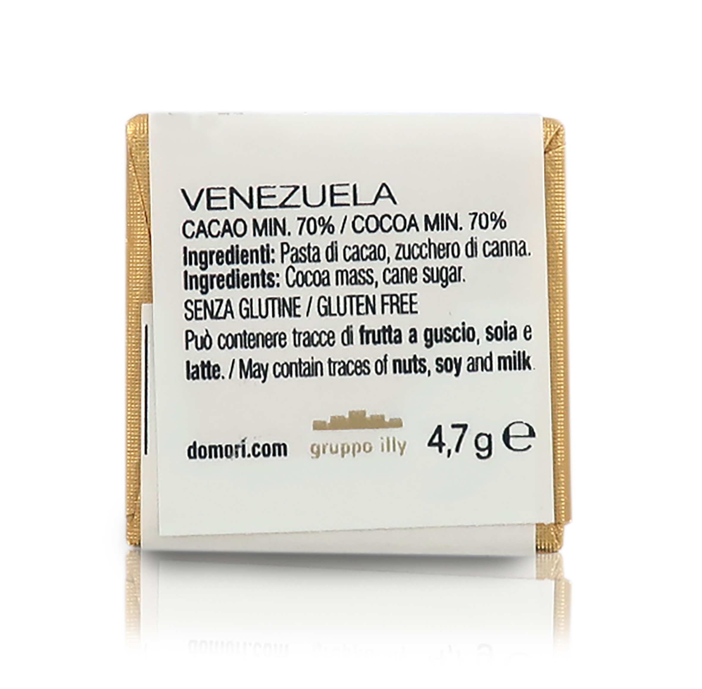 Ingredienti: pasta di cacao origine Venezuela, zucchero di Canna. Può contenere tracce di LATTE, SOIA e FRUTTA A GUSCIO.