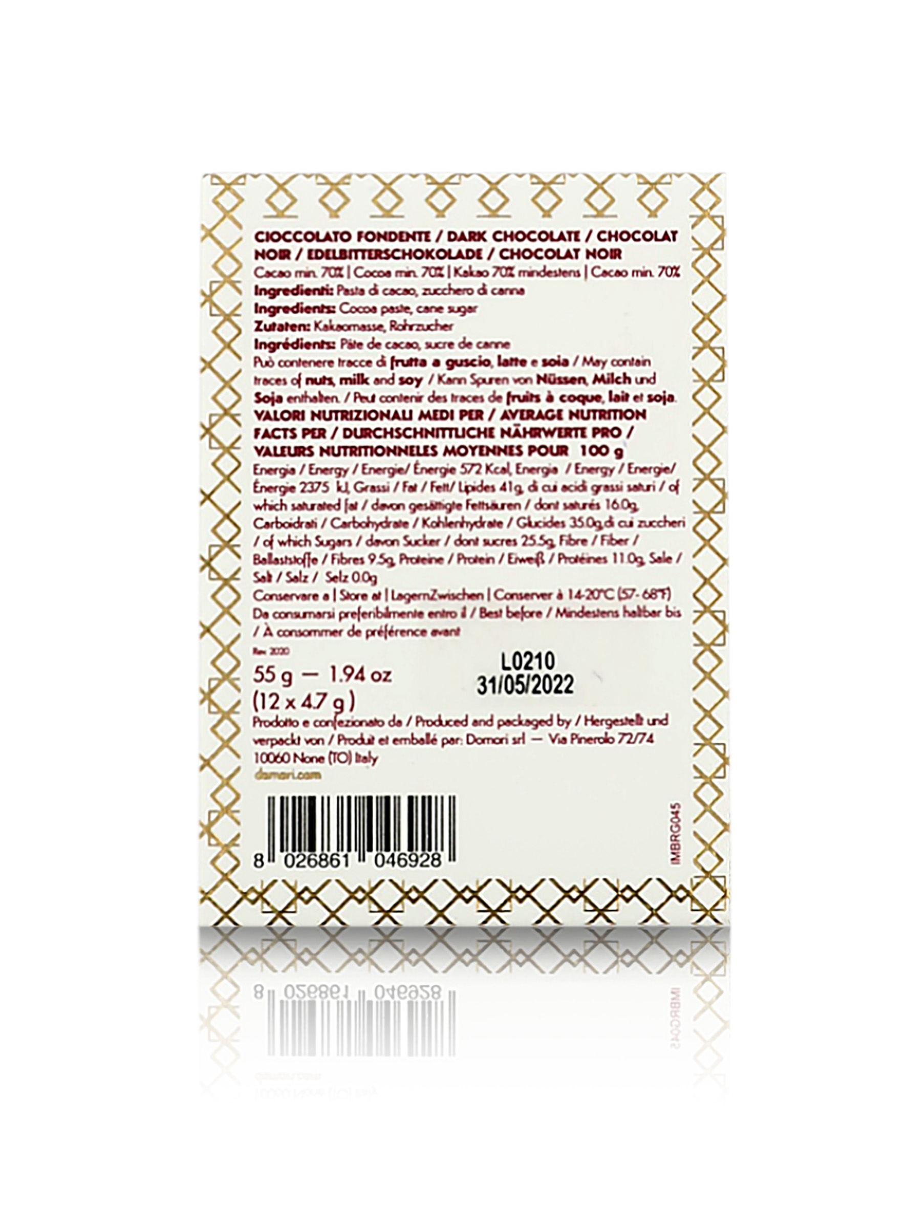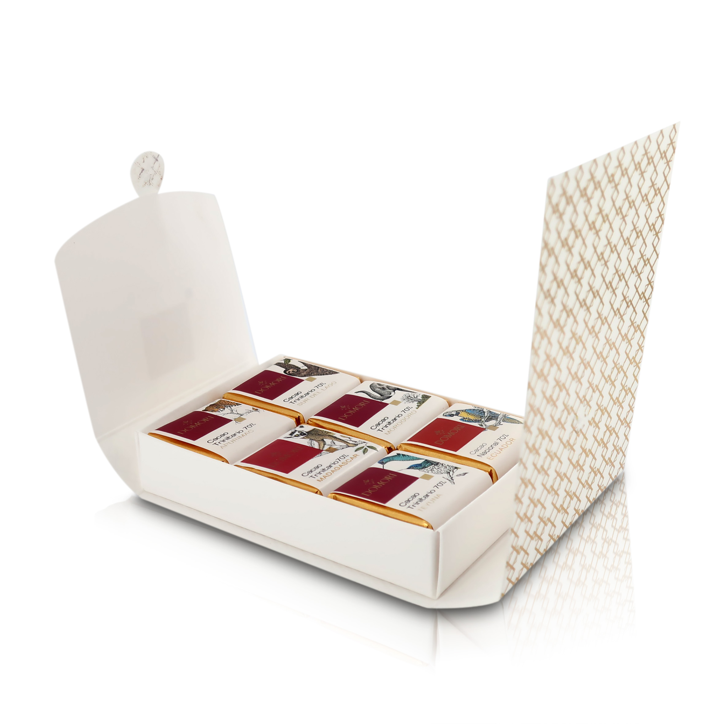 In questo pratico astuccio sono presenti 12 Napolitains da 4,7g cadauno, prodotti con cacao Single Origins (monovarietale) proveniente dai seguenti paesi: Perù, Colombia, Ecuador, Madagascar, Tanzania e Venezuela.