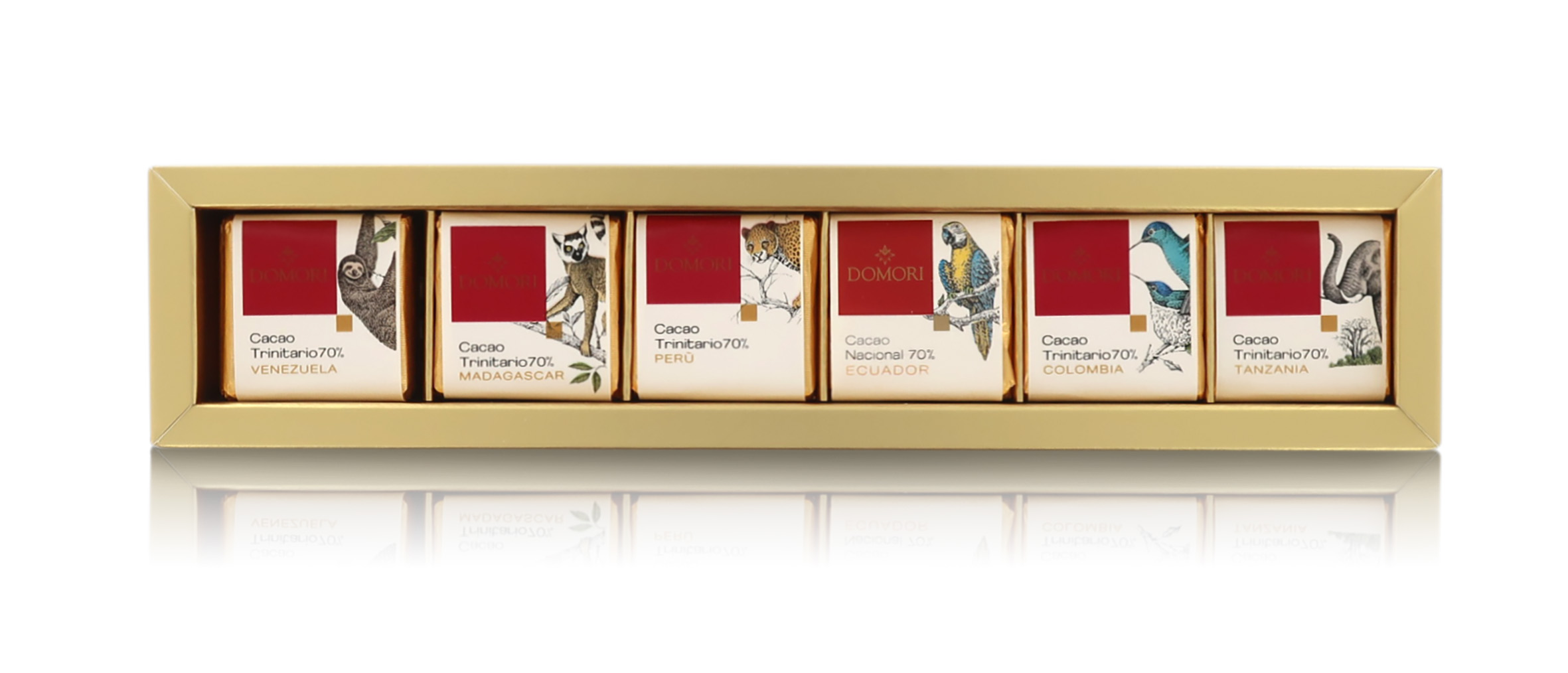L'elegante cofanetto rettangolare, di forma allungata, contiene un totale di 30 cioccolatini Napolitain incartati singolarmente da 4,7g cadauno, con 5 cioccolatini per ogni varietà: Venezuela, Madagascar, Perù, Ecuador, Colombia e Tanzania.