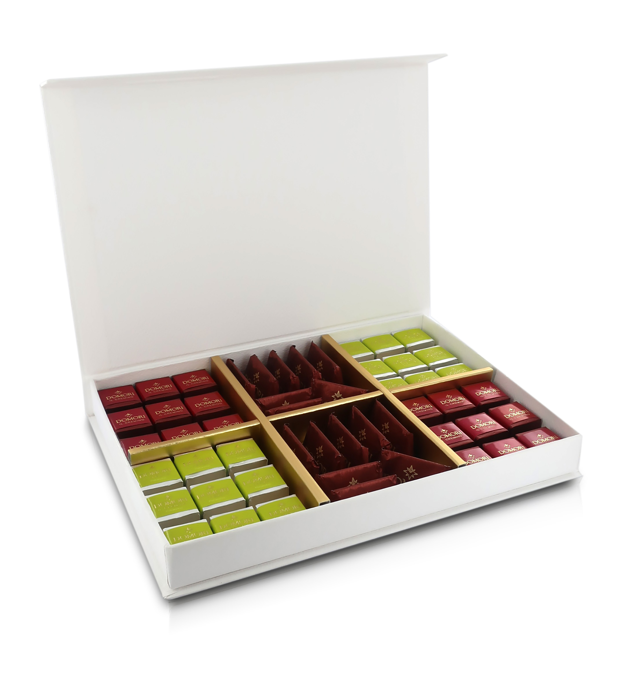 La gioiosa confezione regalo n° 6 contiene mini-gianduiotti, cremini al pistacchio e classici, tutti incartati singolarmente e accomunati dalla qualità Domori, dall'inconfondibile cacao aromatico e dal gusto pieno della NOCCIOLA.