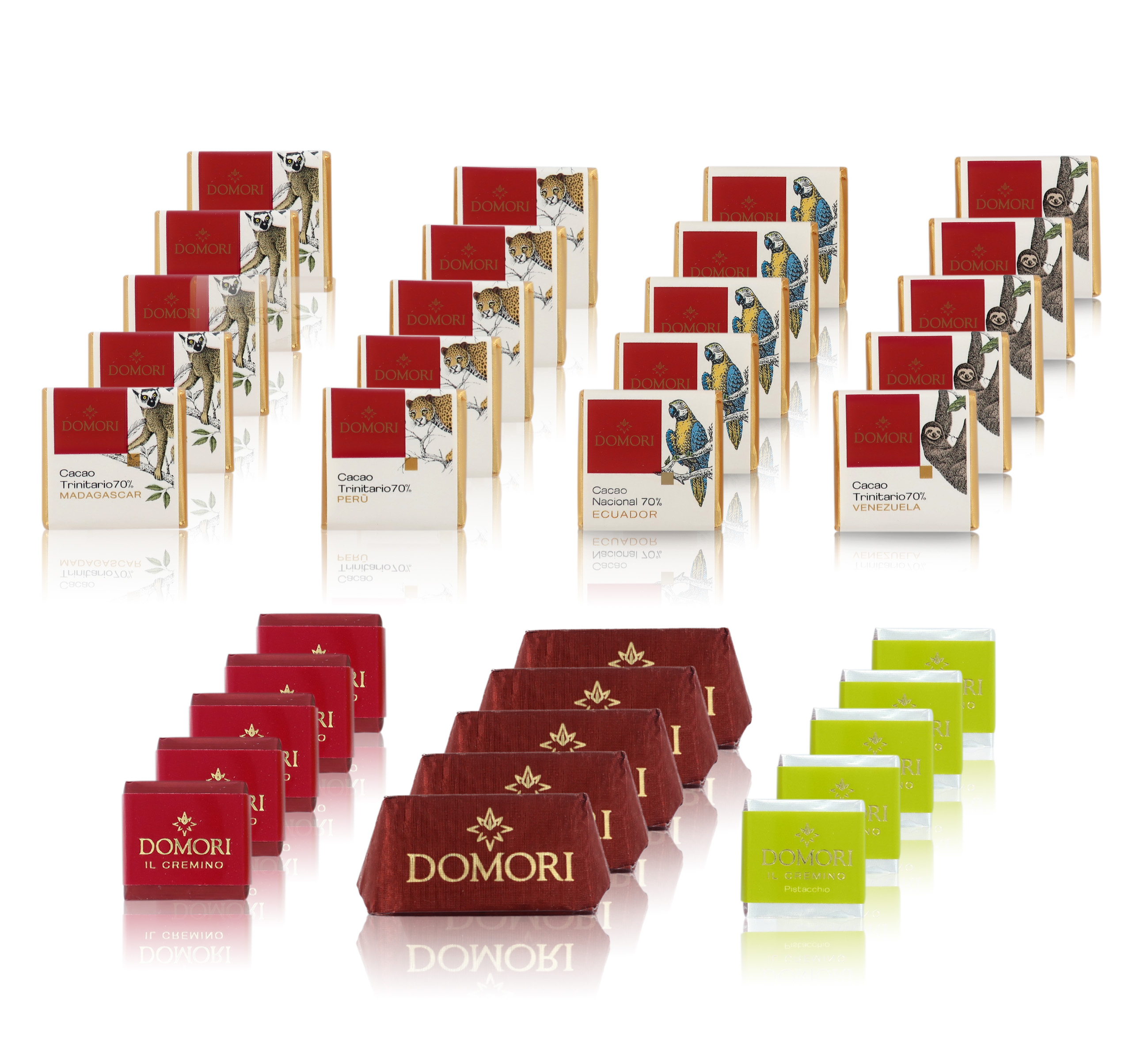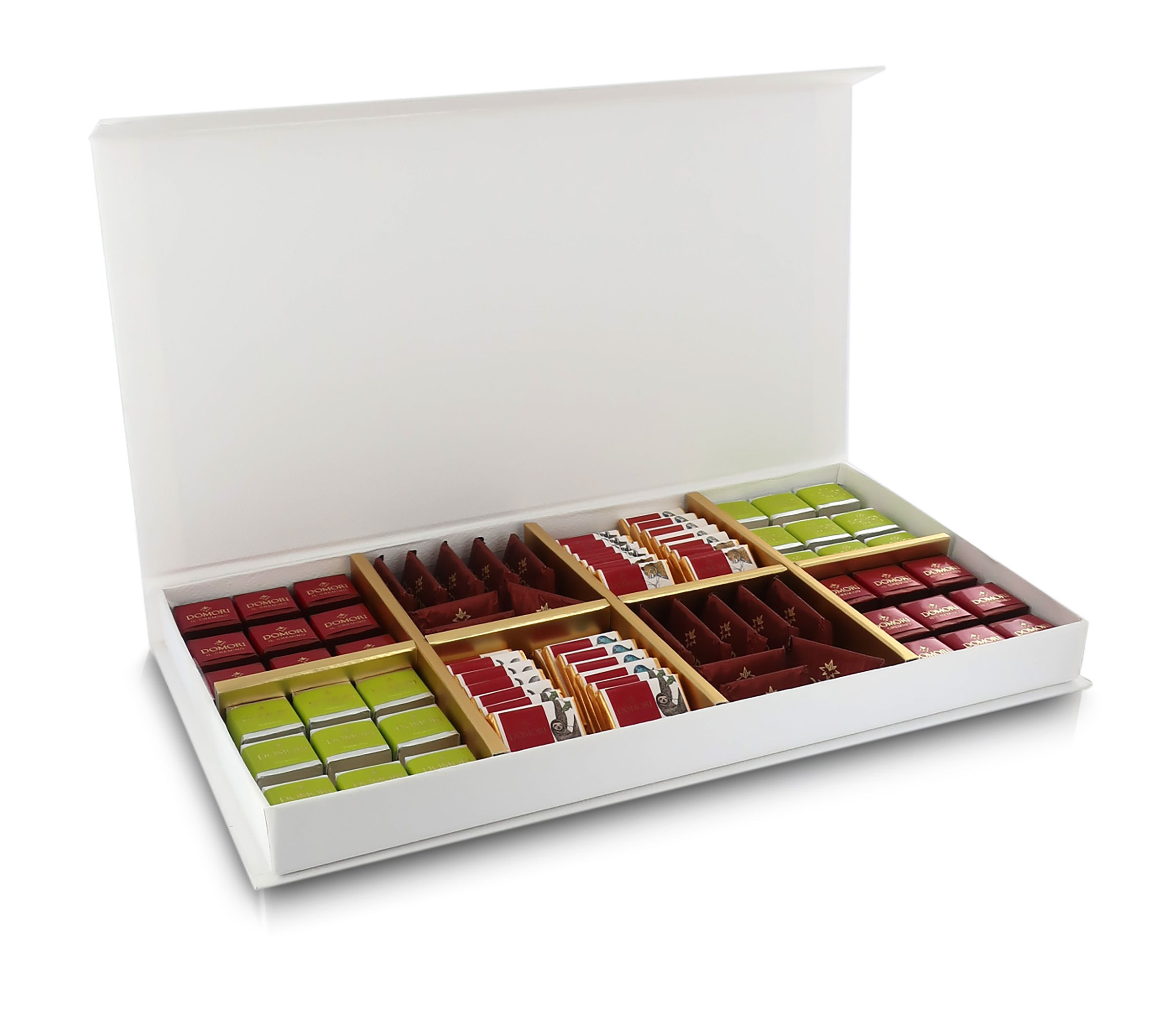 Il cofanetto contiene una ricca e varia selezione di 80 cioccolatini; nello specifico, potrete degustare 16 gianduiotti / 18 cremini al pistacchio / 18 cremini in versione classica / 28 napolitains (cioccolatini fondenti) realizzati con cacao pregiati monovarietali.