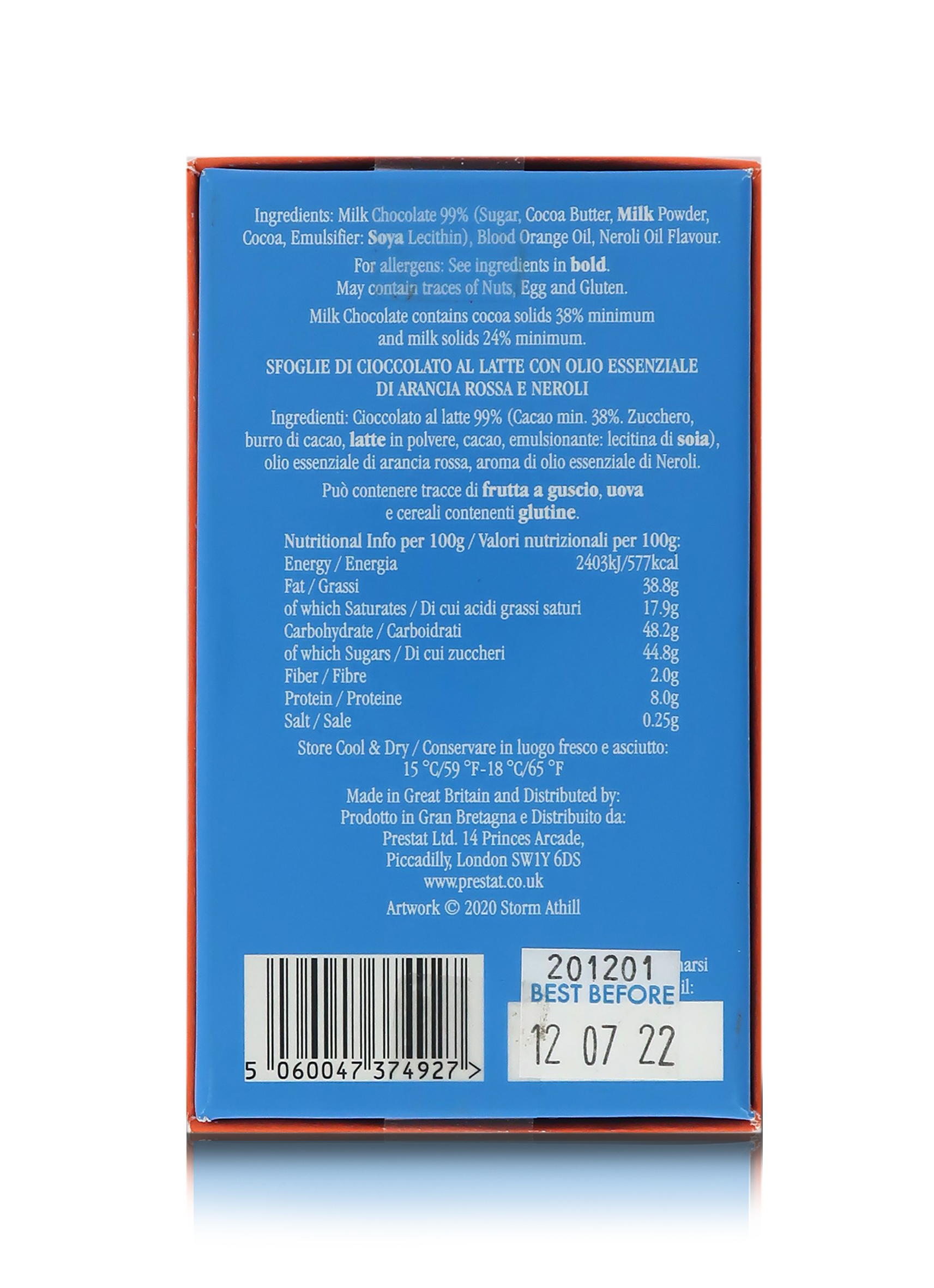 Il bellissimo cofanetto rettangolare di color arancione acceso, azzurro e blu custodisce delle sottili sfoglie di cioccolato al latte, delicate nell'aspetto e piacevolmente aromatizzate all’arancia rossa e Neroli. Il Neroli è un olio essenziale prodotto per distillazione dei fiori di arancio amaro. Il sapore del fine cioccolato al latte ben si sposa con la spiccata nota profumata e agrumata data dal Neroli e dall’arancia rossa. Queste iconiche sfoglie di cioccolato (“thins”), apprezzate dalla Casa Reale Inglese e dalla nobiltà tanto quanto dalle stelle del mondo dello spettacolo, saranno una gradita idea regalo tanto nel periodo natalizio quanto durante il resto dell’anno.