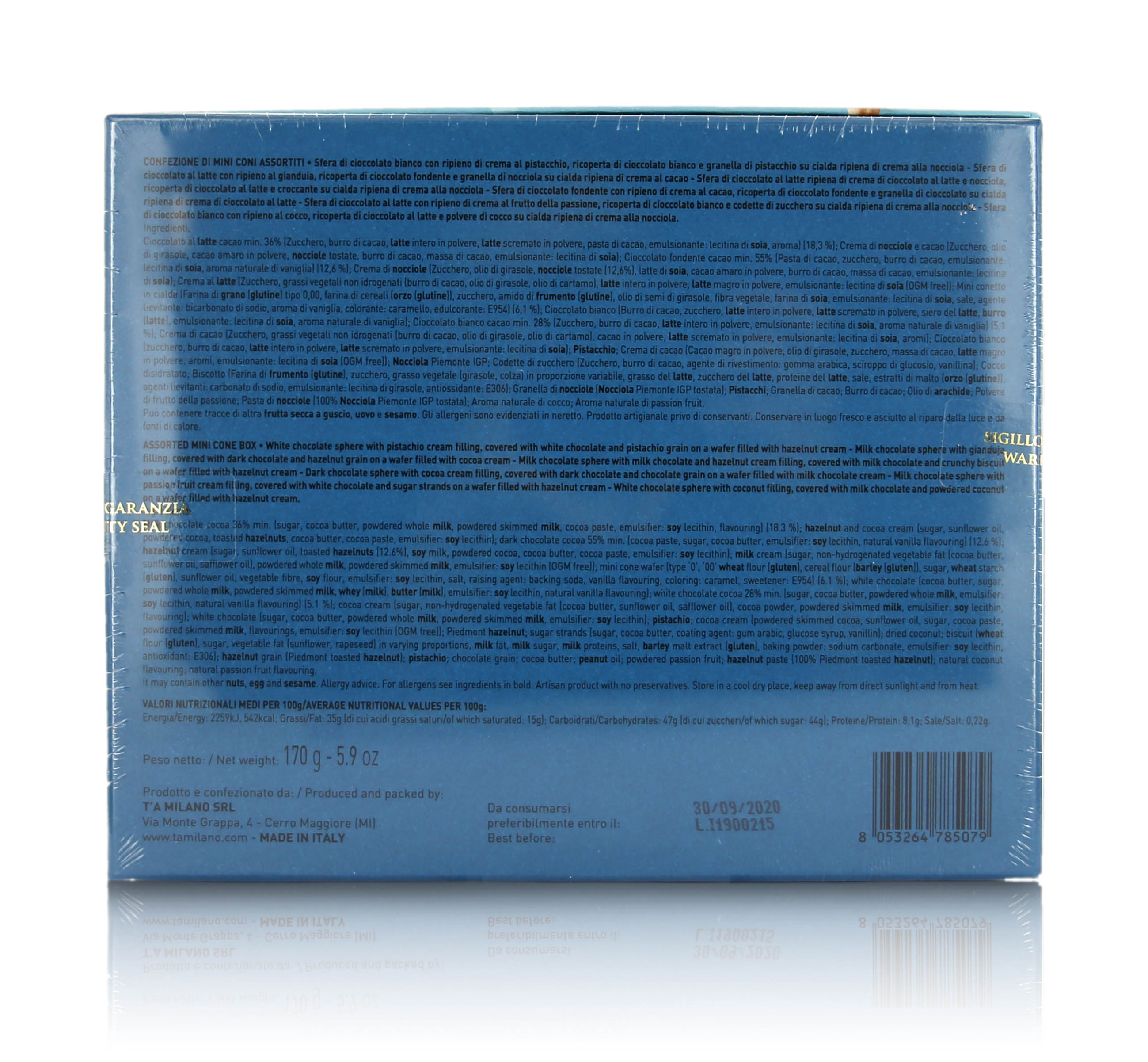 Cono al pistacchio: ripieno alla nocciola, sfera di cioccolato bianco con cuore di crema al pistacchio. Copertura con cioccolato bianco con pezzi di pistacchio. // Cono alla crema al cacao: ripieno al cioccolato al latte, sfera di crema al cacao con copertura al cioccolato fondente. // Cono al cioccolato al latte: ripieno alla nocciola, sfera al cioccolato al latte ricoperta da cioccolato al latte. // Cono al cocco: ripieno alla nocciola, sfera al cocco ricoperta di cioccolato al latte e granella di cocco. // Cono al frutto della passione: ripieno alla nocciola, sfera al frutto della passione ricoperta di cioccolato biondo e codette di zucchero. // Cono alla gianduia: sfera di cioccolato al latte ripiena di deliziosa crema al gianduia, ricoperta di cioccolato fondente e granella di nocciola, su un mini cono ripieno di crema al cacao. Allergeni: NOCCIOLE, ARACHIDI, PISTACCHIO, LATTE E PRODOTTI A BASE DI LATTE, GRANO, BURRO, ORZO, SOIA, CEREALI CONTENENTI GLUTINE. Può contenere tracce di: CEREALI CONTENENTI GLUTINE, ALTRA FRUTTA A GUSCIO, SEMI DI SESAMO, UOVA.