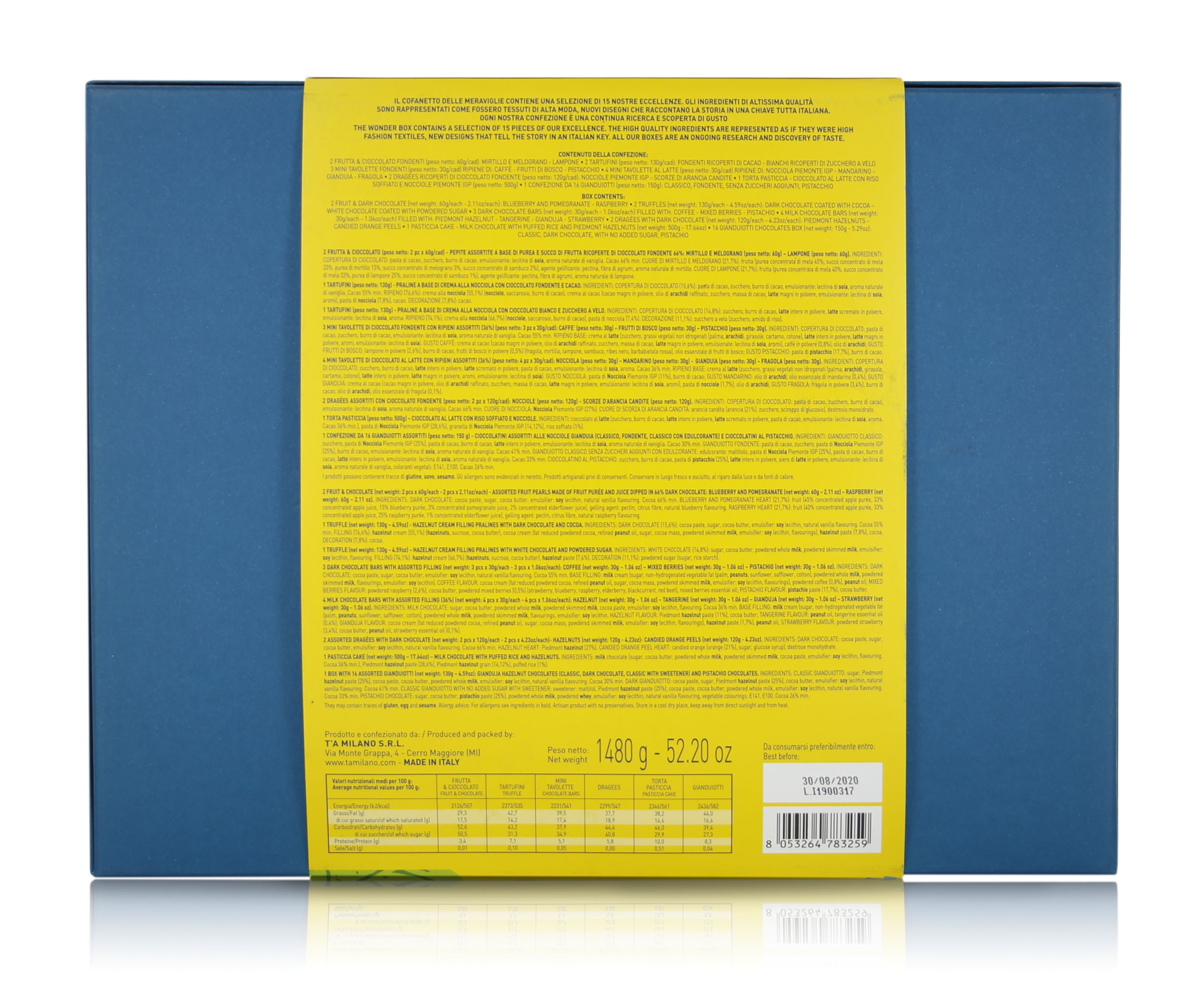 Una elegante confezione racchiude una selezione dei prodotti T'a Milano, pronta a stupirti con le sue meraviglie dolci! Per accontentare vari palati, la confezione contiene Frutta & Cioccolato, Tartufi, Mini tavolette di cioccolato, Dragées, Torta Pasticcia e Gianduiotti. Nello specifico: Frutta & Cioccolato - mirtillo e melograno fondente (60 g) / Frutta & Cioccolato - lampone fondente (60 g) / Tartufini fondenti ricoperti di cacao (130 g) / Tartufini bianchi ricoperti di zucchero a velo (130 g) / Mini tavoletta fondente ripiena al caffè (30 g) / Mini tavoletta fondente ripiena ai frutti di bosco (30 g) / Mini tavoletta fondente ripiena al pistacchio (30 g) / Mini tavoletta al latte ripiena alla nocciola IGP Piemonte (30 g) / Mini tavoletta al latte ripiena al mandarino (30 g) / Mini tavoletta al latte ripiena al gianduia (30 g) / Mini tavoletta al latte ripiena alla fragola (30 g) / Dragées - nocciola IGP Piemonte fondente (120 g) / Dragées - scorza d'arancia candita fondente (120 g) / Torta Pasticcia - cioccolato al latte con nocciole e riso soffiato (500 g) / Confezione da 16 Gianduiotti: latte, fondente, pistacchio, senza zucchero (150 g).