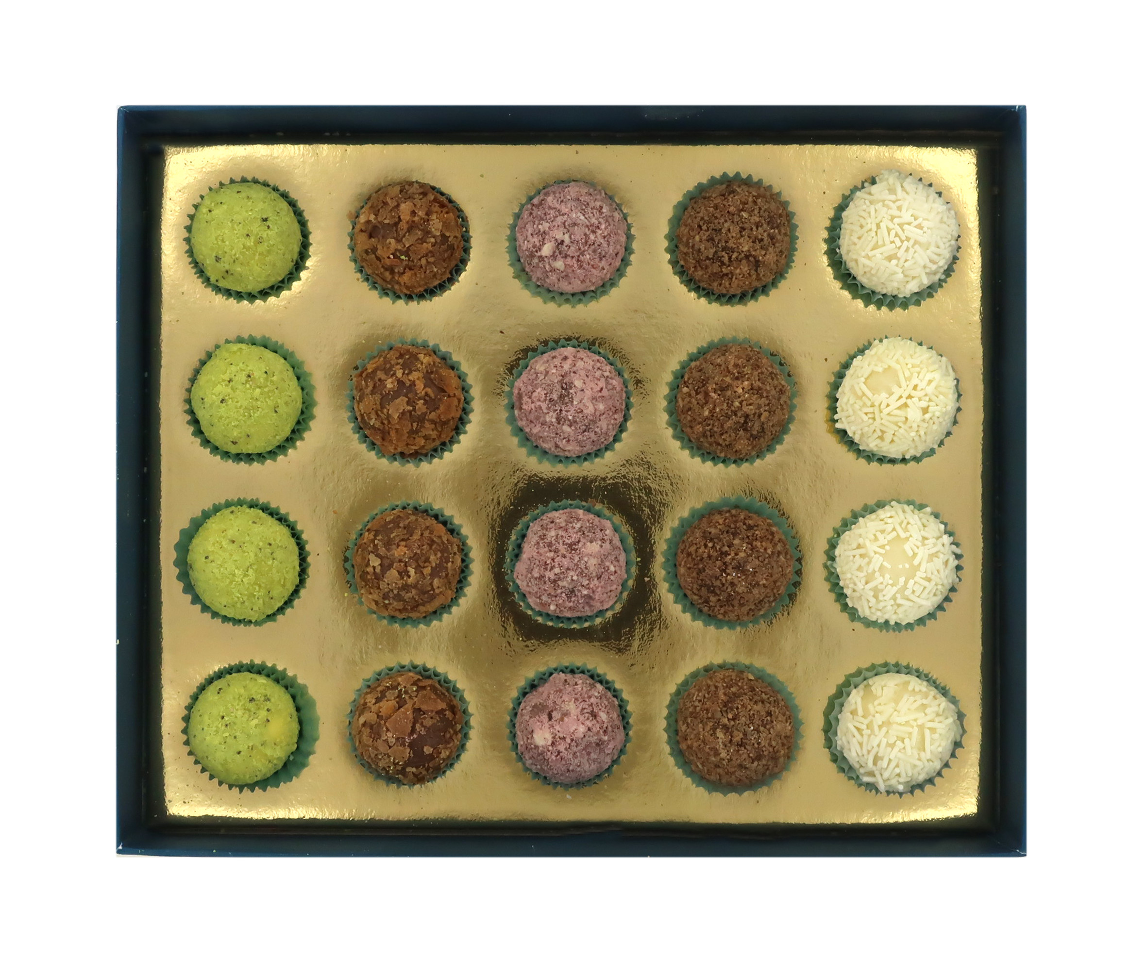 Elegante confezione di 20 deliziose sfere di cioccolato con un morbido ripieno, realizzate completamente a mano dai maître chocolatier di T'a Milano. Questa confezione di cioccolatini è adatta per essere regalata come parte di un cesto gastronomico o anche da sola.