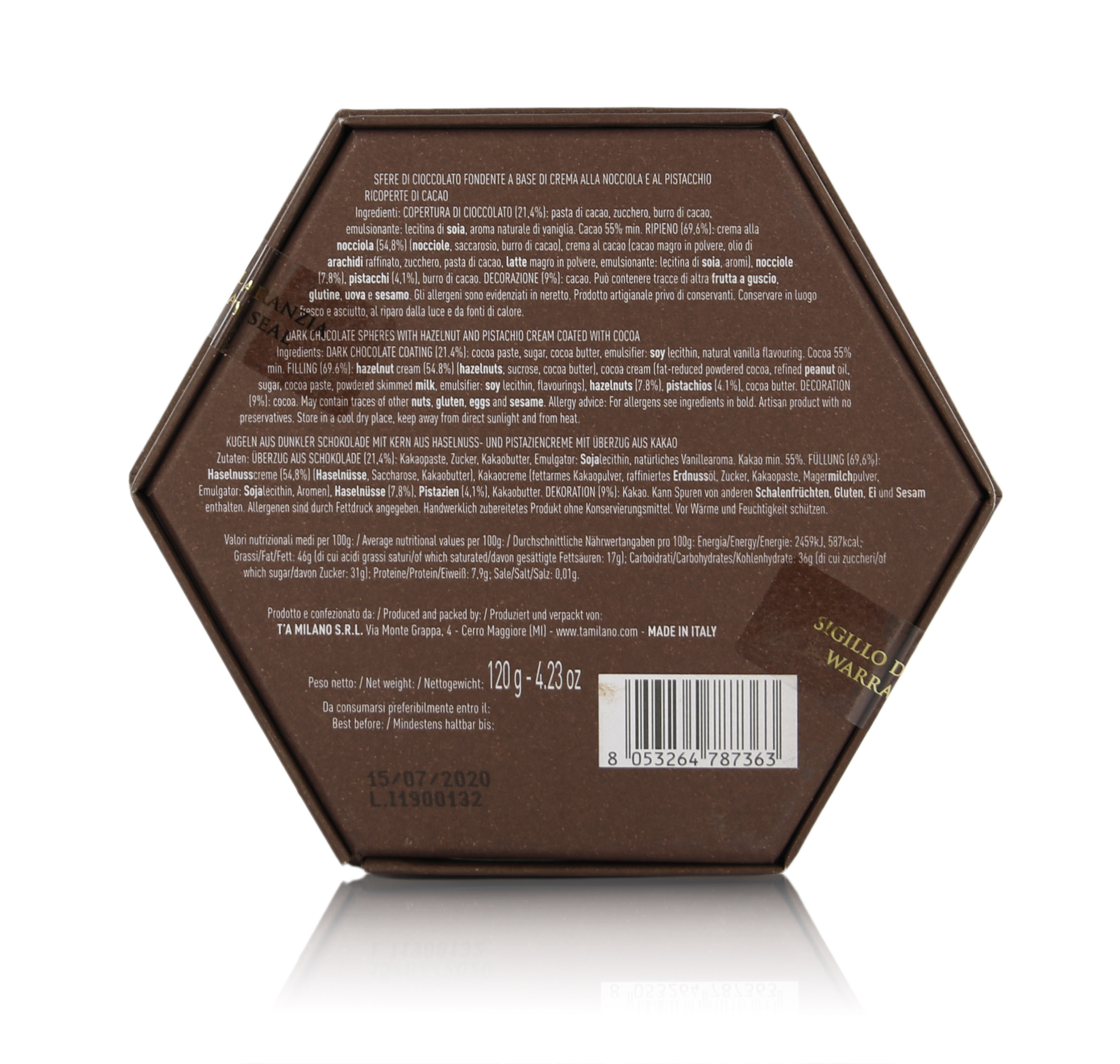 Una elegante confezione esagonale racchiude 14 tartufini in due gusti: 7 al cioccolato fondente e 7 al cioccolato fondente al pistacchio. Per mantenerne l'integrità e fare in modo che risaltino in tutta la loro bellezza, i tartufi sono riposti in appositi alloggiamenti sagomati e disposti su due livelli. La variante al cioccolato fondente ha un ripieno a base di nocciola e cioccolato fondente, mentre quella al pistacchio vanta un ripieno cremoso a base di nocciola e pistacchio. I tartufini sono realizzati con cioccolato fondente artigianale. L'esterno è ricoperto di cacao in polvere. Sono perfetti da offrire ai vostri ospiti insieme al caffè o come piccolo regalo per gli amanti dei dolci.