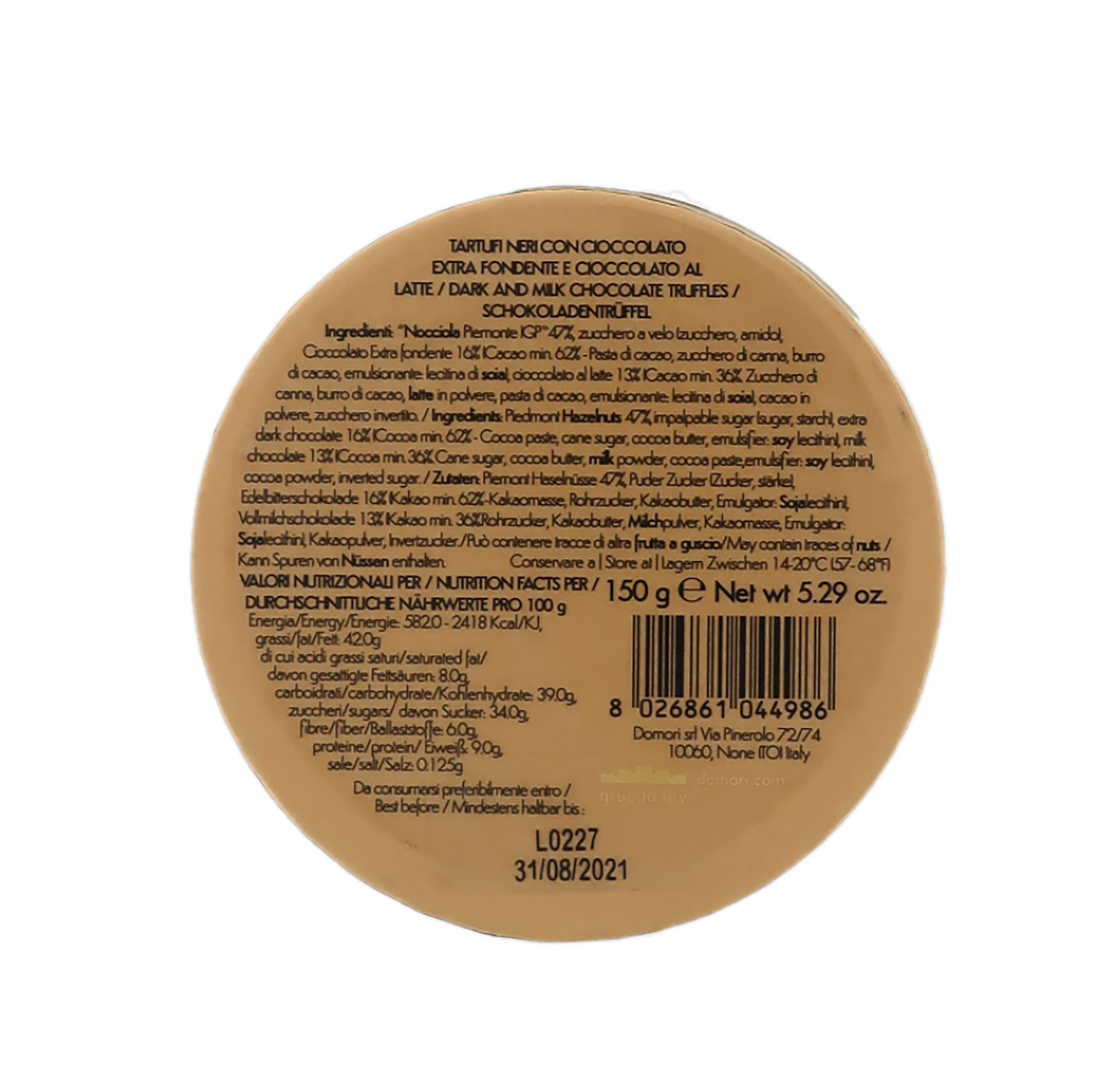 Ingredienti: "NOCCIOLA Piemonte IGP" (min. 47%), zucchero a velo (zucchero, amido), cioccolato extra fondente 16% (cacao min. 62% - pasta di cacao, zucchero di canna, burro di cacao. Emulsionante: lecitina di soia), cioccolato al latte 13% (cacao min. 36% - zucchero di canna, burro di cacao, latte in polvere, pasta di cacao. Emulsionante: lecitina di soia), cacao in polvere, zucchero invertito.
