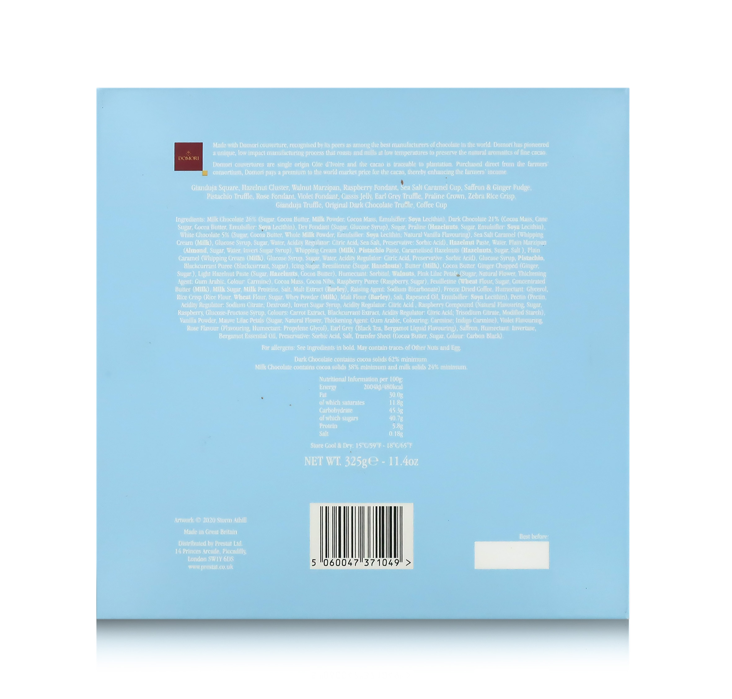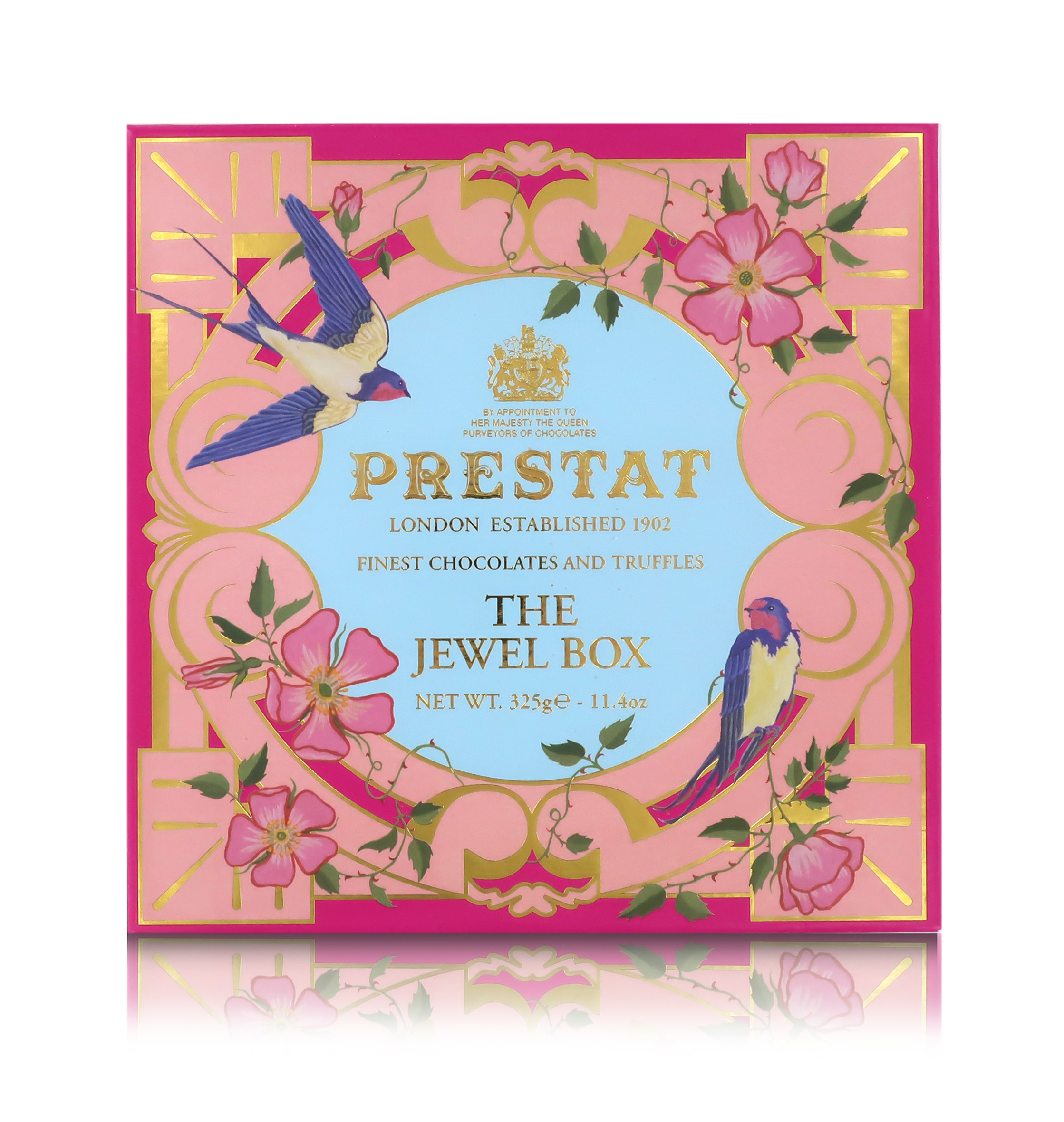 Cofanetto quadrato di color rosa, dalle tinte accese, che racchiude 25 praline assortite. La Jewel Box è tra i pezzi forti dello sfarzoso assortimento Prestat. Questa confezione particolare è ispirata alla scatola di cioccolatini personale della Regina Vittoria, regolarmente rifocillata dai collaboratori delle Cucine Reali. La finissima selezione comprende 25 praline di cioccolato gourmet, la cui copertura è realizzata con pregiatissimo cioccolato Domori Single Origin. La selezione include fondant alla rosa, alla viola e al lampone, praline con marzapane e noci, ganache, gelatine e tartufi. Ingredienti: vedere confezione.