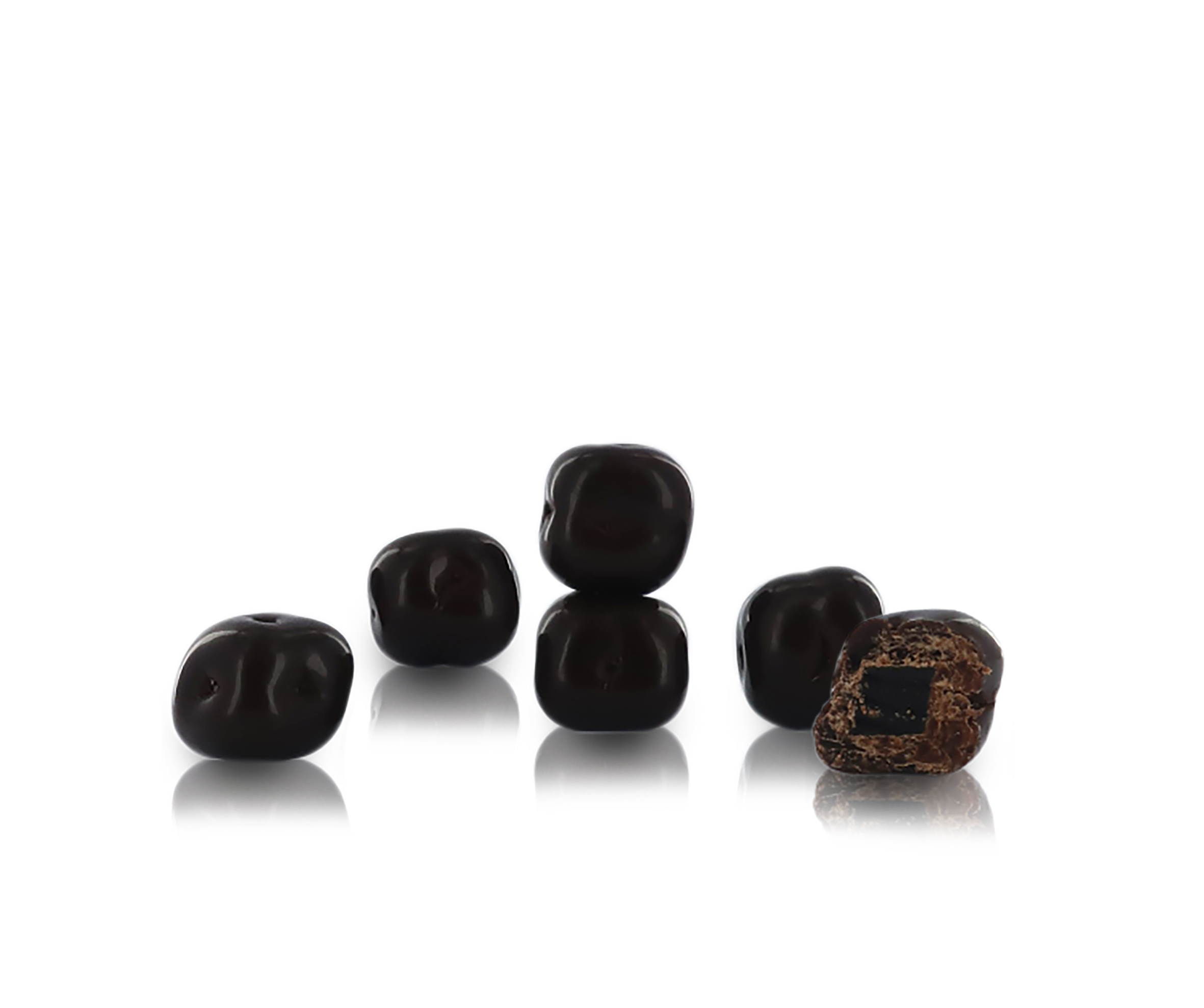 Mirtillo e melograno rivestiti di cioccolato fondente 66% (60g).