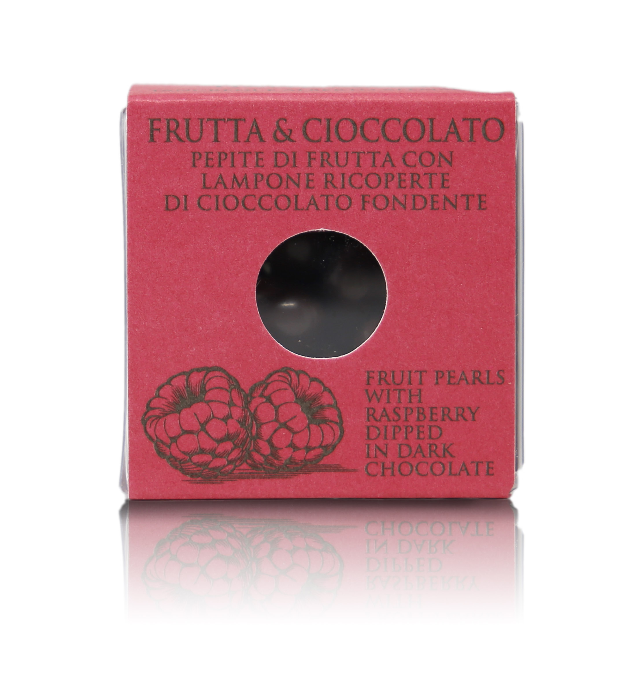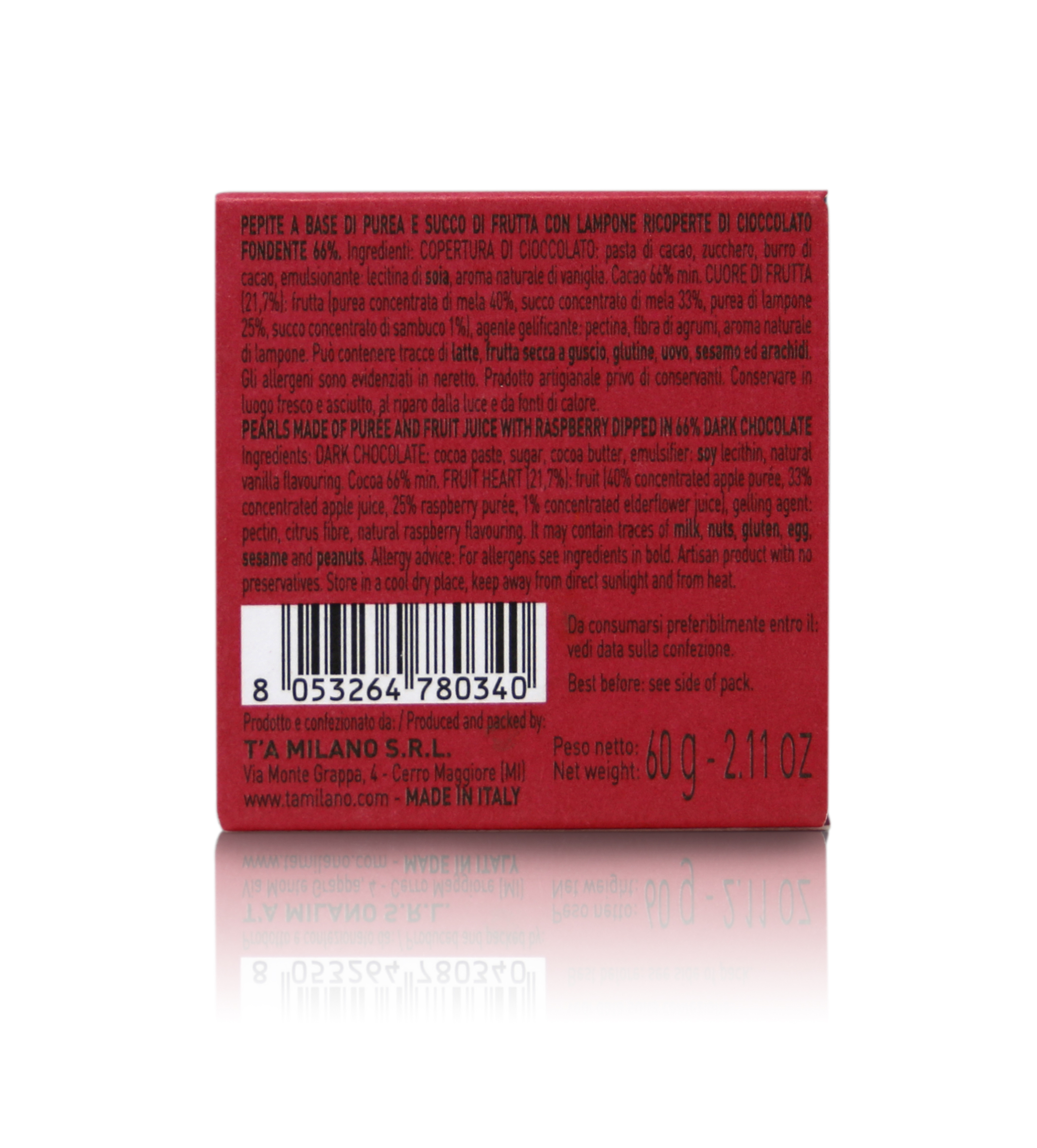 Una moderna confezione a forma di cubo, grazie ad alcuni lati trasparenti, lascia intravedere queste deliziose praline ricoperte di cioccolato fondente, che nascondono un cuore morbido di purea di lampone. Il cioccolato fondente usato per rivestire queste pepite di frutta è artigianale e contiene almeno il 66% di cacao.