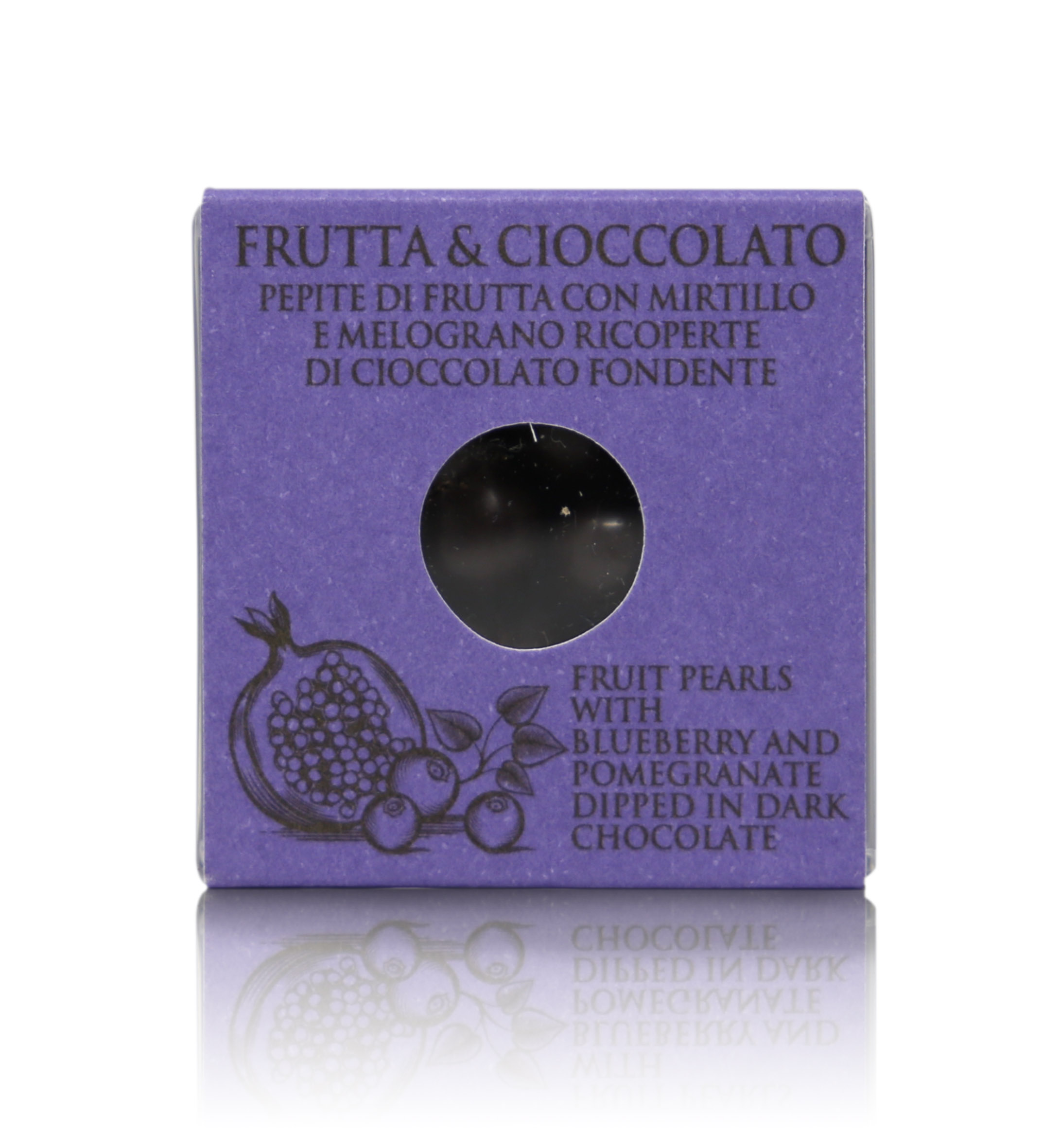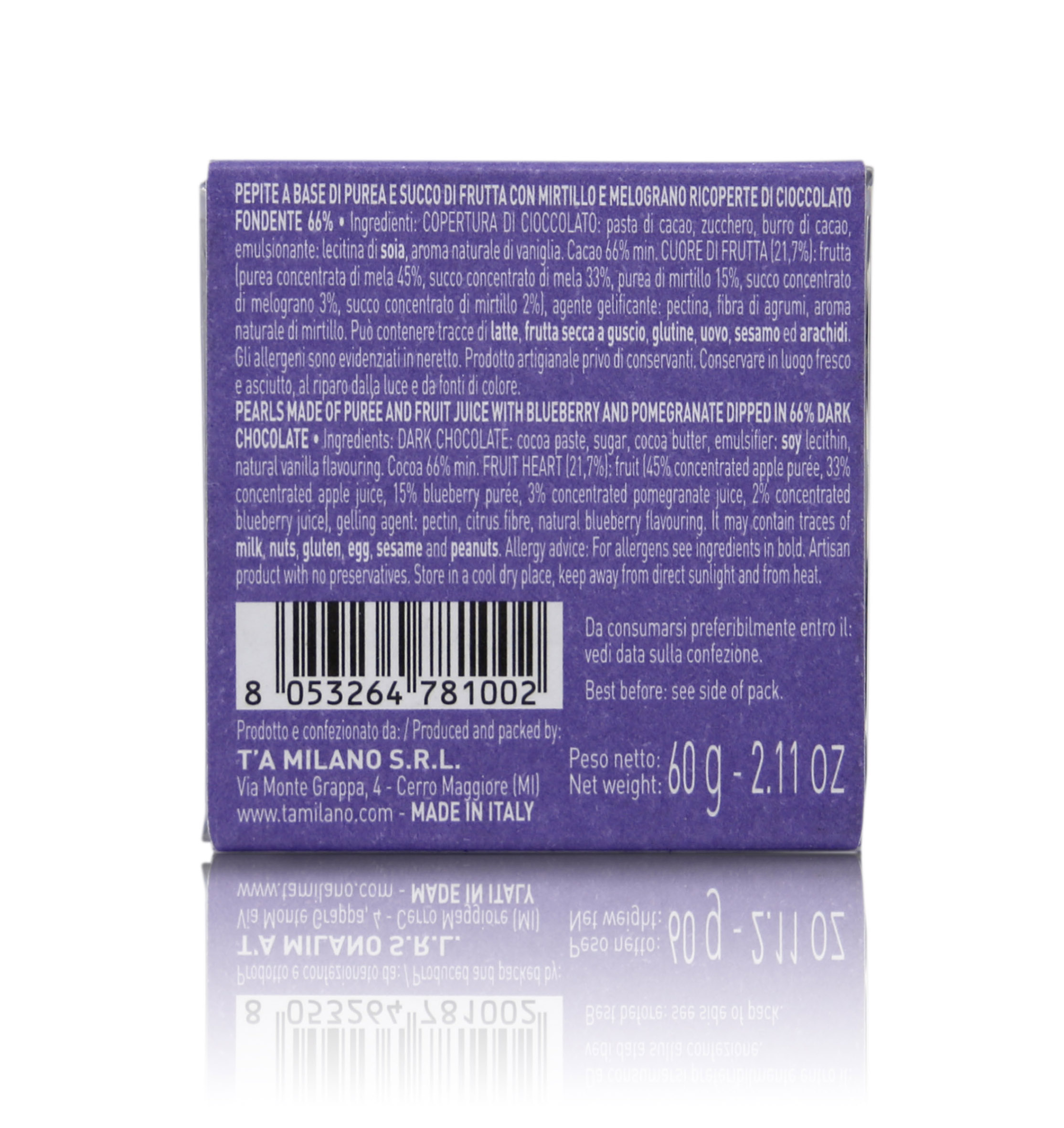 Una moderna confezione a forma di cubo, grazie ad alcuni lati trasparenti, lascia intravedere queste deliziose praline ricoperte di cioccolato fondente, che nascondono un cuore morbido di purea di frutta al mirtillo e melograno. Il cioccolato fondente usato per rivestire queste pepite di frutta è artigianale e contiene almeno il 66% di cacao.