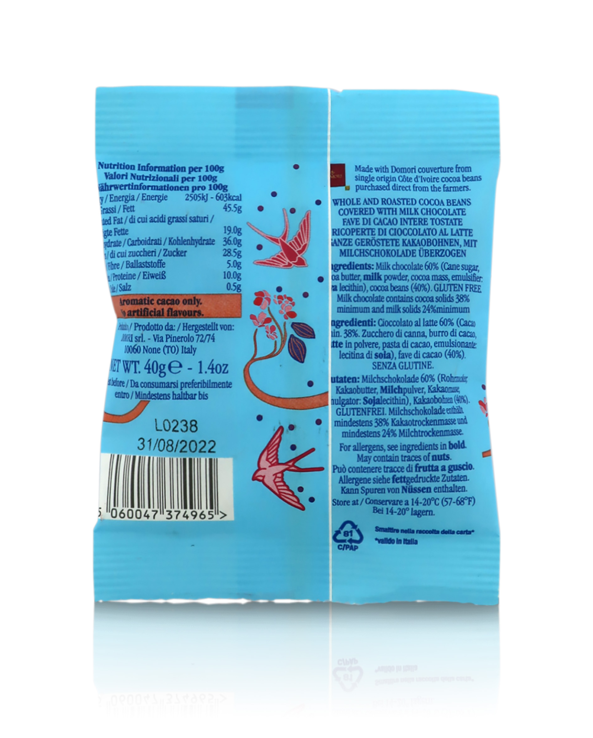 12 sacchettini di pregiate fave di cacao, sapientemente tostate e ricoperte di finissimo cioccolato al latte 38% Domori. Queste piccole delizie ricoperte di cioccolato al latte offrono una squisita combinazione di cremosità e croccantezza.