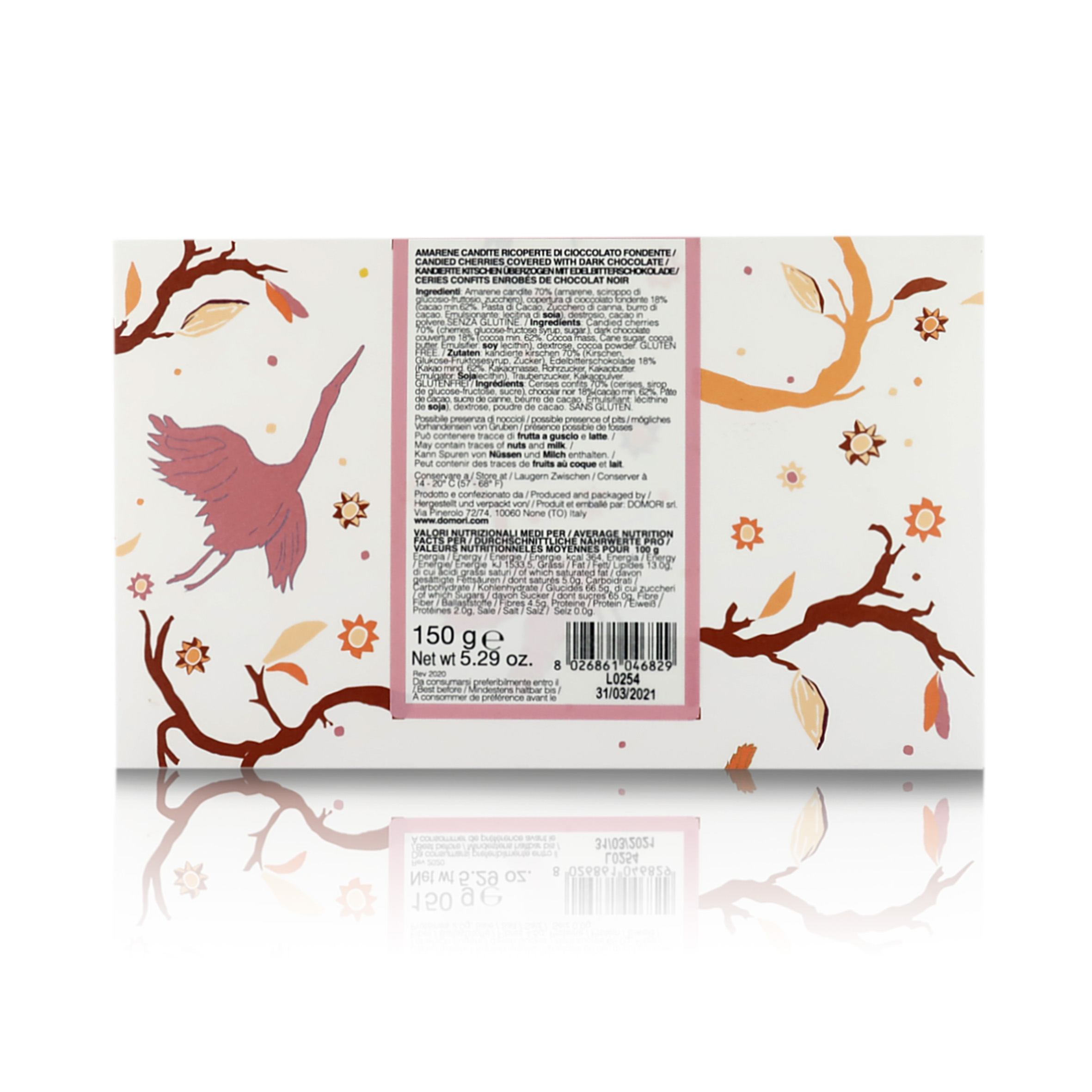 La passione per il gusto di Domori ha portato la casa cioccolatiera a proporre un accostamento classico in propria chiave: la dolcezza avvolgente di amarene sapientemente selezionate e candite da Agrimontana incontrano l'aroma intenso del cioccolato fondente di alta qualità di varietà Arriba (Ecuador). Le polpose amarene candite ricoperte di cioccolato sono lo snack gourmet ideale per le vostre dolci pause.