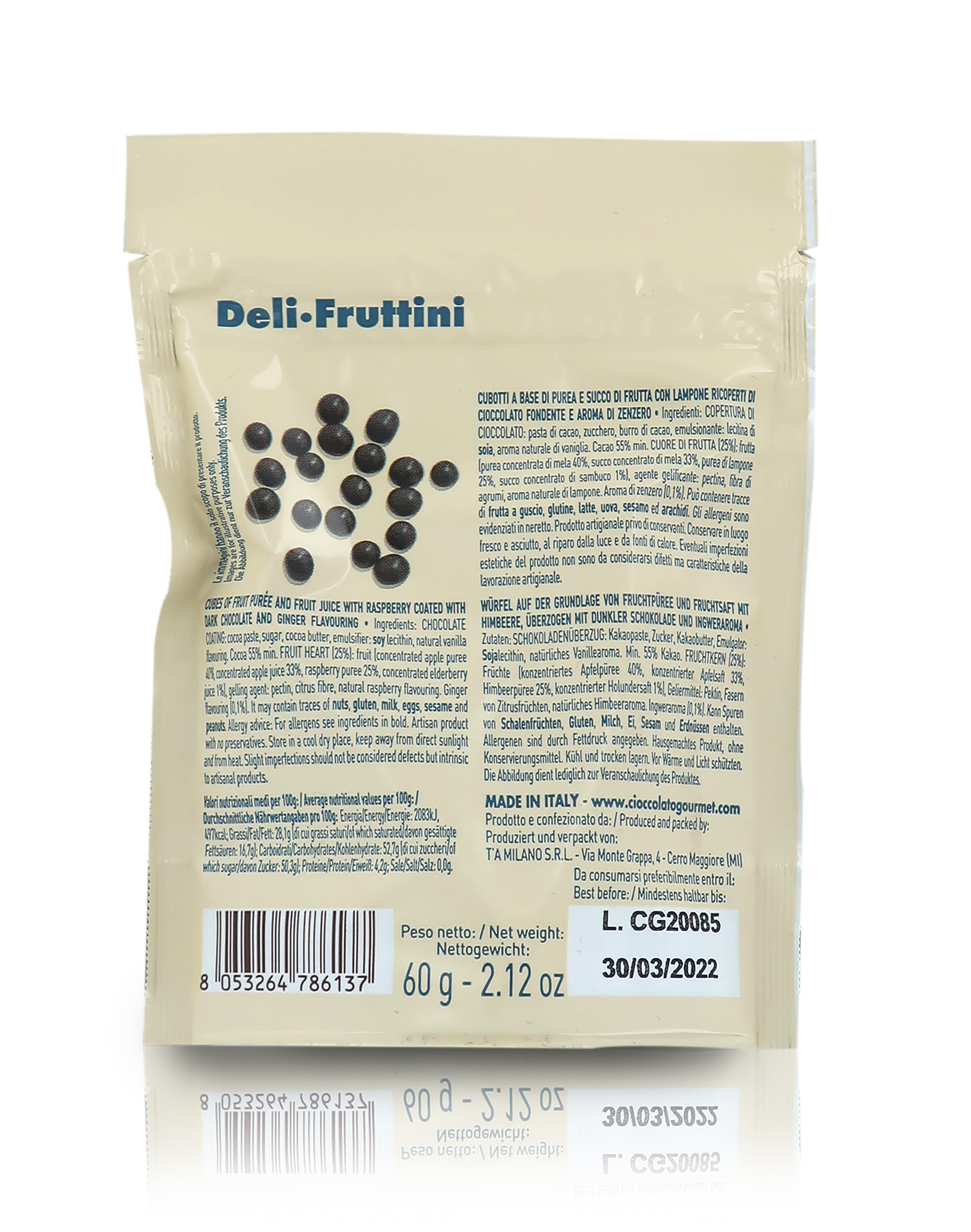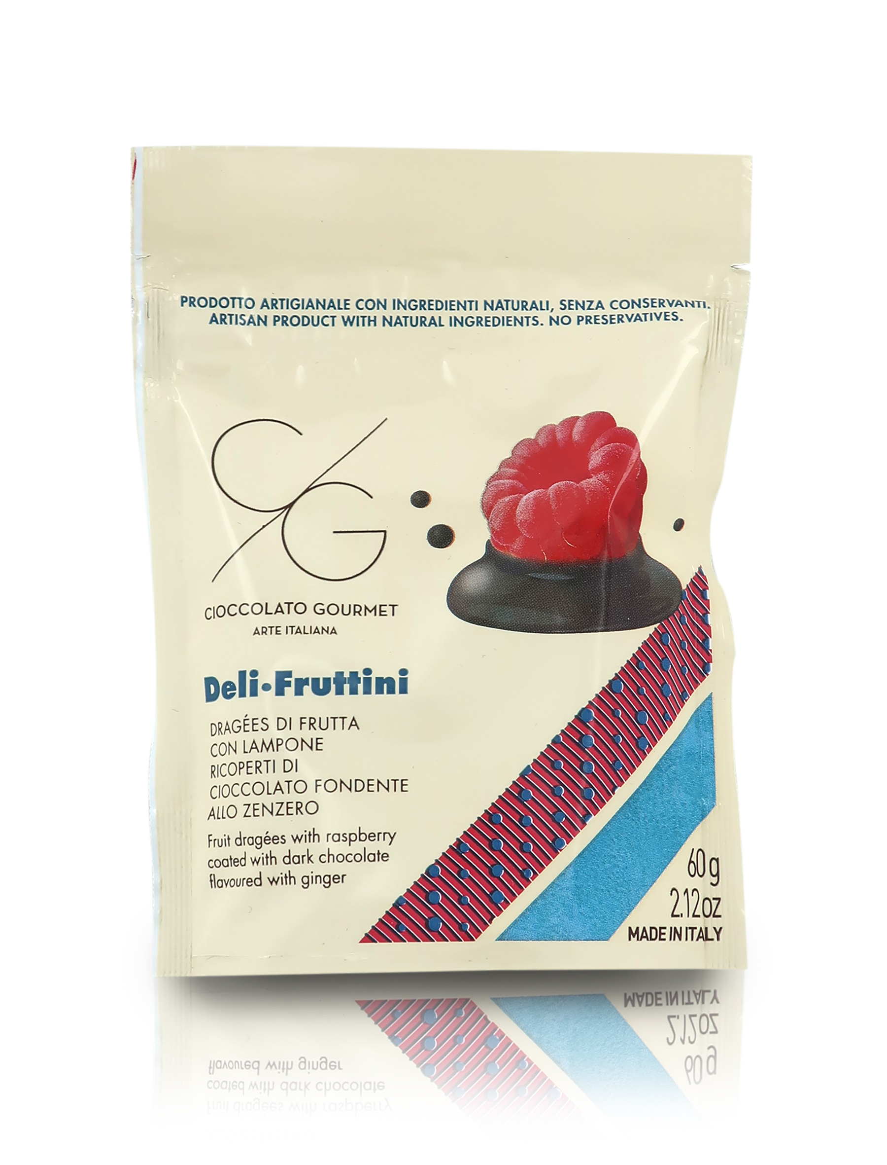 Deli Fruttini: dragées di lampone ricoperti di cioccolato fondente aromatizzato allo zenzero, in comodo sacchettino da 60 grammi.