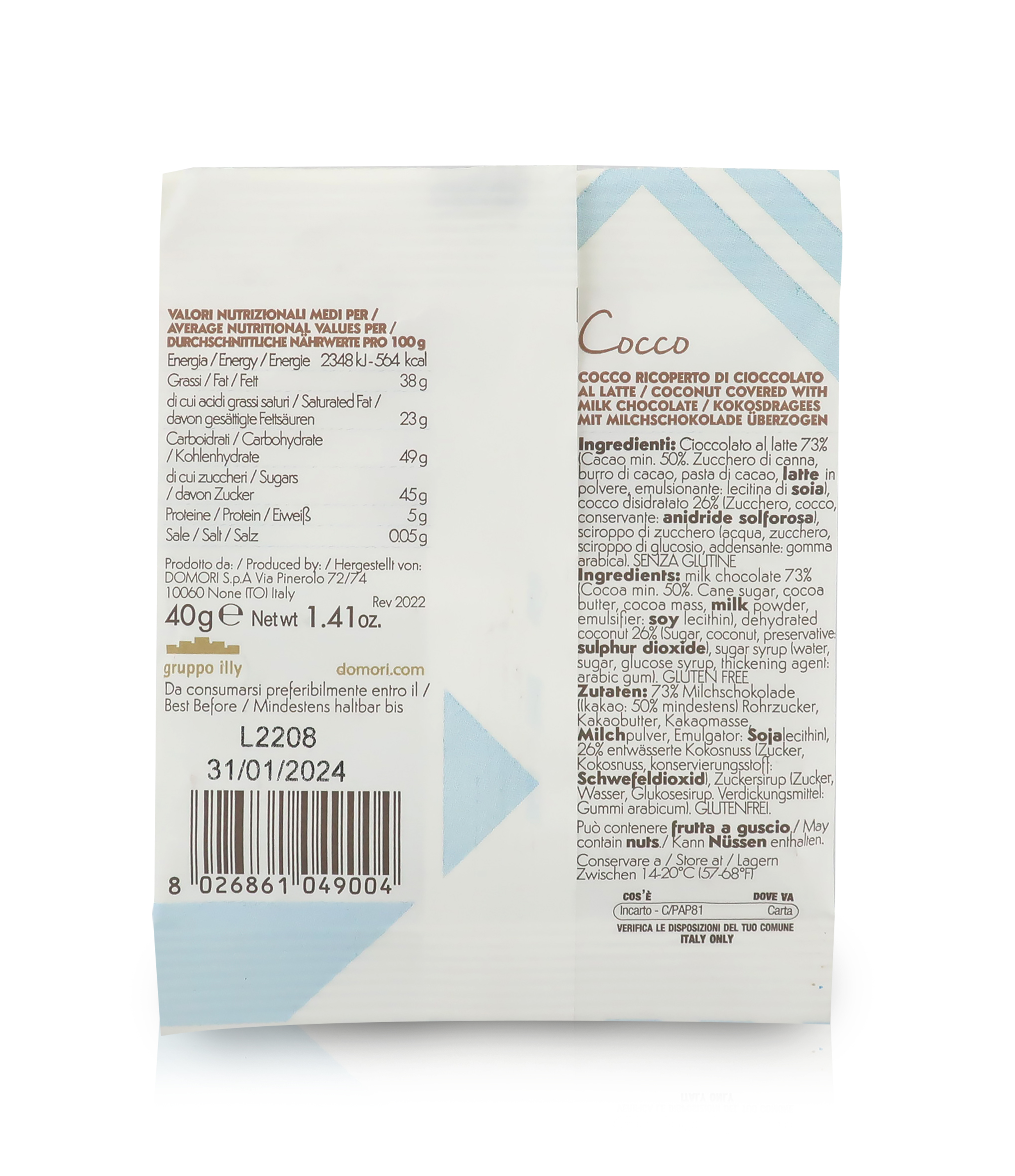 Ingredienti: Cioccolato al latte 73% (Cacao min. 50% - Zucchero di canna, burro di cacao, pasta di cacao, latte in polvere. Emulsionante: lecitina di soia. Estratto di vaniglia naturale), cocco disidratato 26% (Cocco, zucchero. Conservante: E220 Anidride solforosa), sciroppo di zucchero (zucchero, acqua, sciroppo di glucosio. Addensante: gomma arabica). SENZA GLUTINE.
