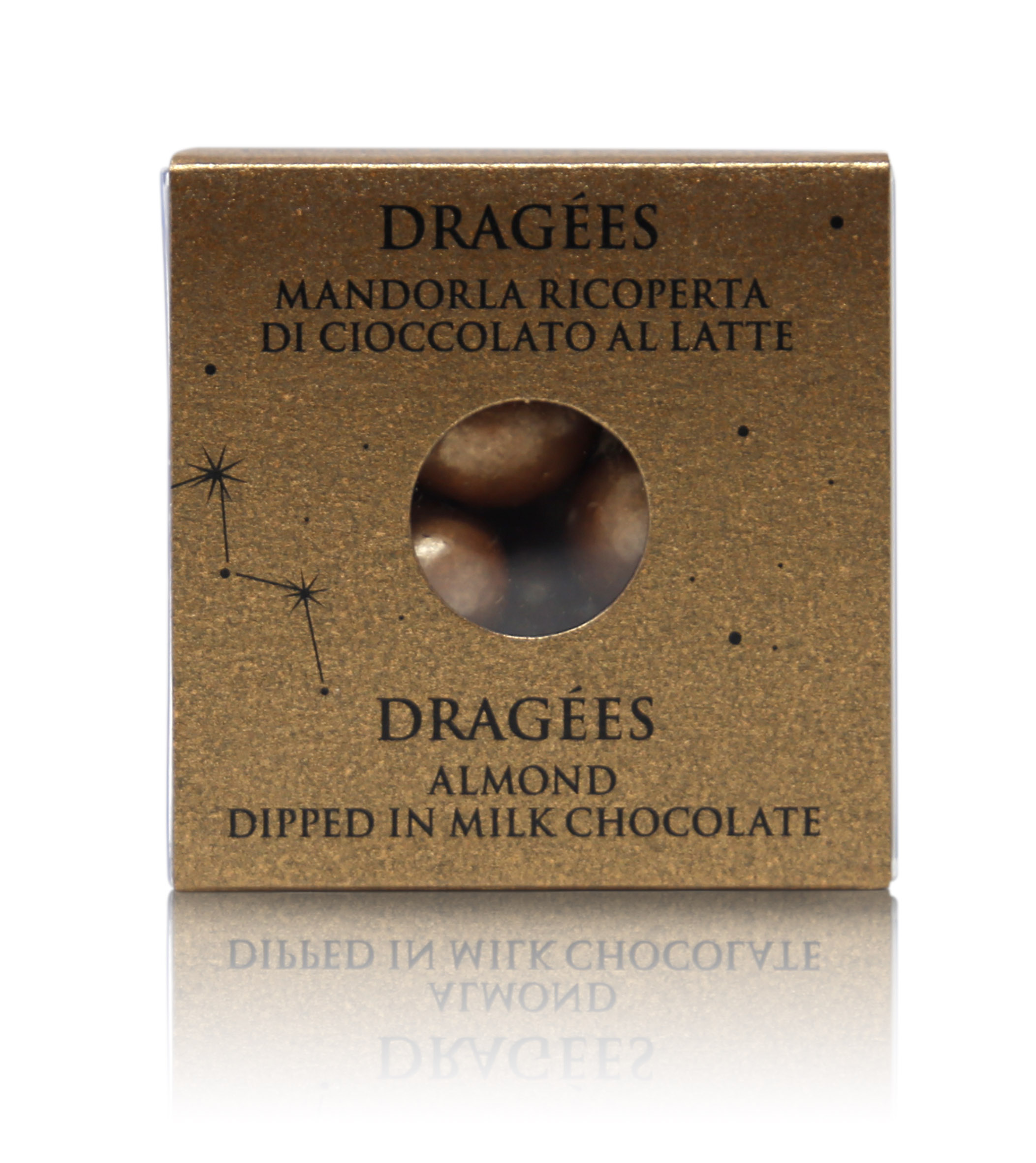Una moderna confezione a forma di cubo, grazie ad alcuni lati trasparenti, lascia intravedere queste deliziose mandorle ricoperte di cioccolato al latte color bronzo (cacao: 36% minimo). I Dragées della Linea Stardust di T'a Milano si contraddistinguono per il loro aspetto super elegante dato dalla loro insolita colorazione. Perfetti da offrire ai vostri ospiti insieme al caffè o come piccolo regalo per gli amanti dei dolci.