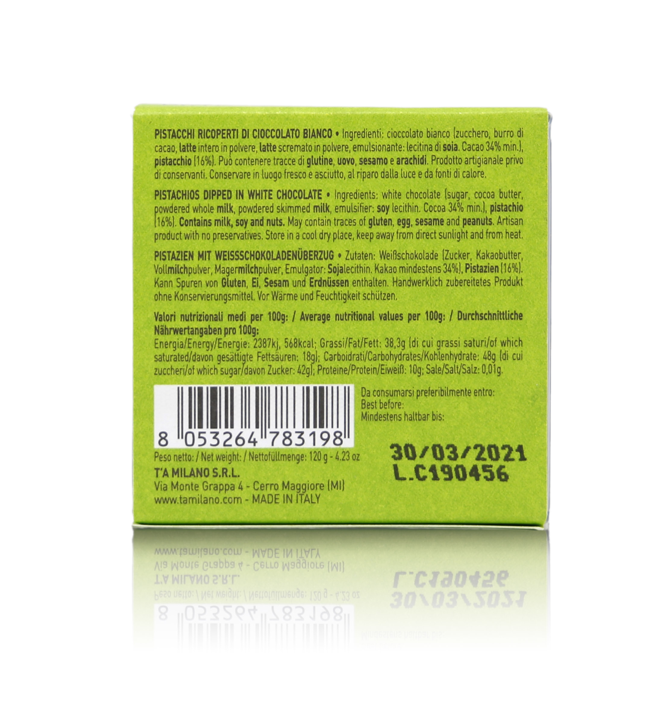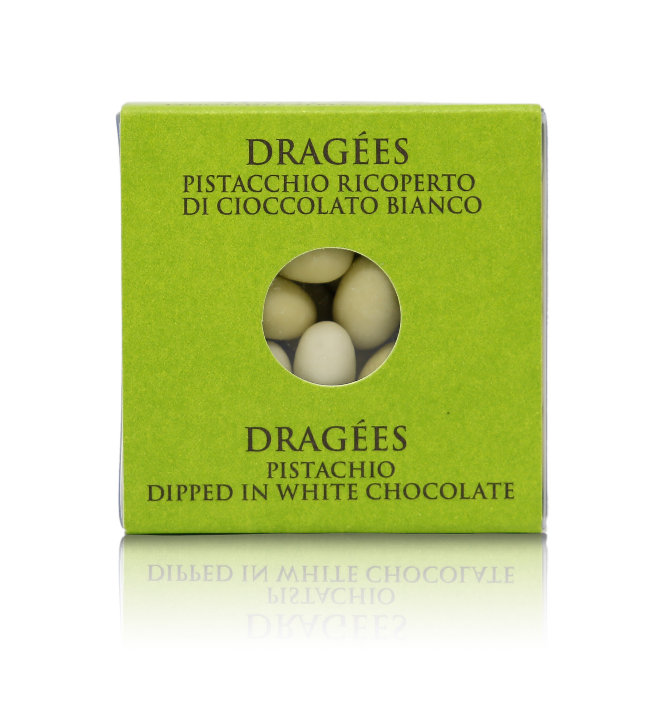 Una moderna confezione a forma di cubo, grazie ad alcuni lati trasparenti, lascia intravedere questi deliziosi pistacchi ricoperti di cioccolato bianco (34% di cacao min.). I Dragées classici alla frutta secca di T'a Milano sono perfetti da offrire ai vostri ospiti insieme al caffè o come piccolo regalo per gli amanti della piccola pasticceria.