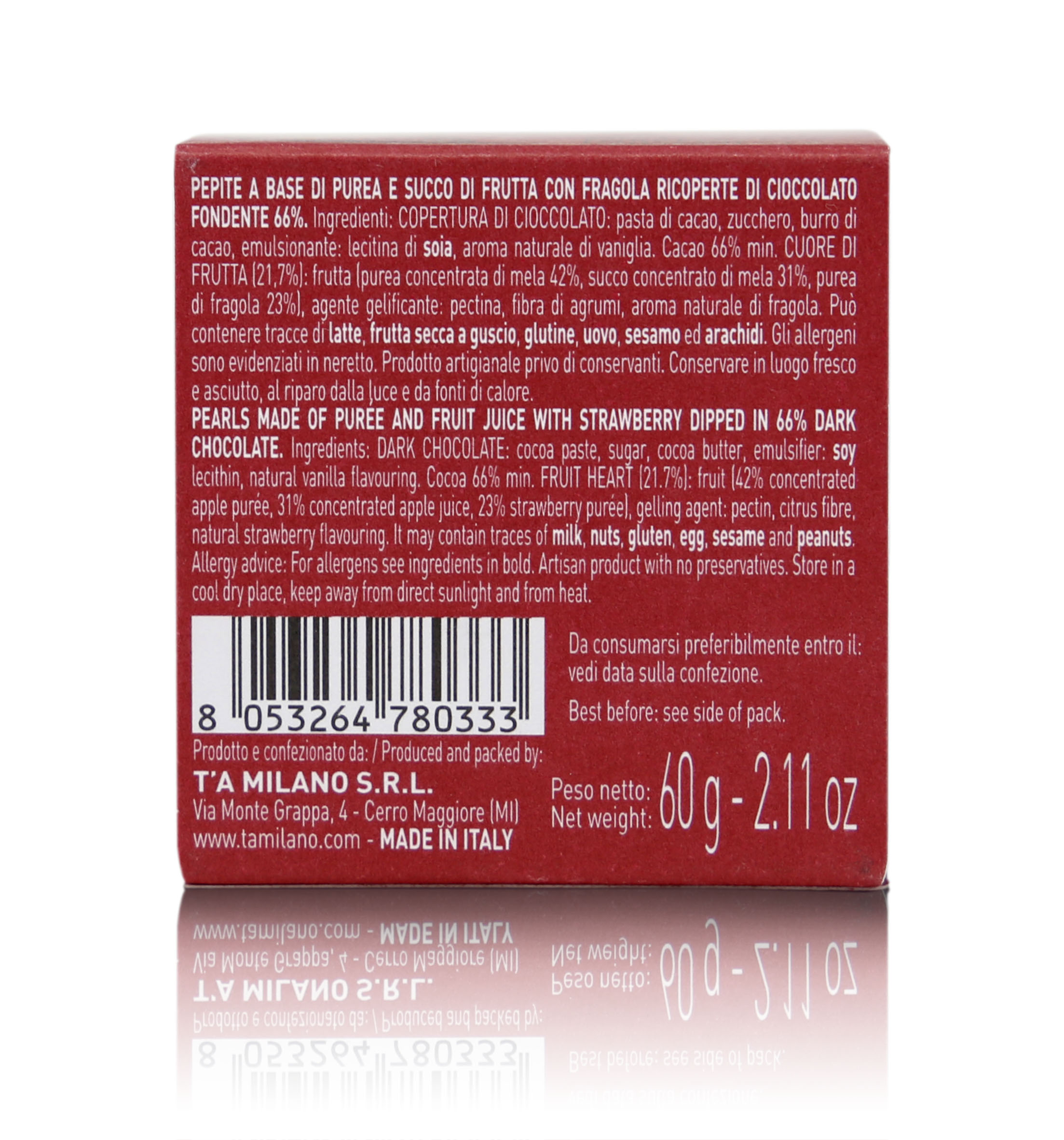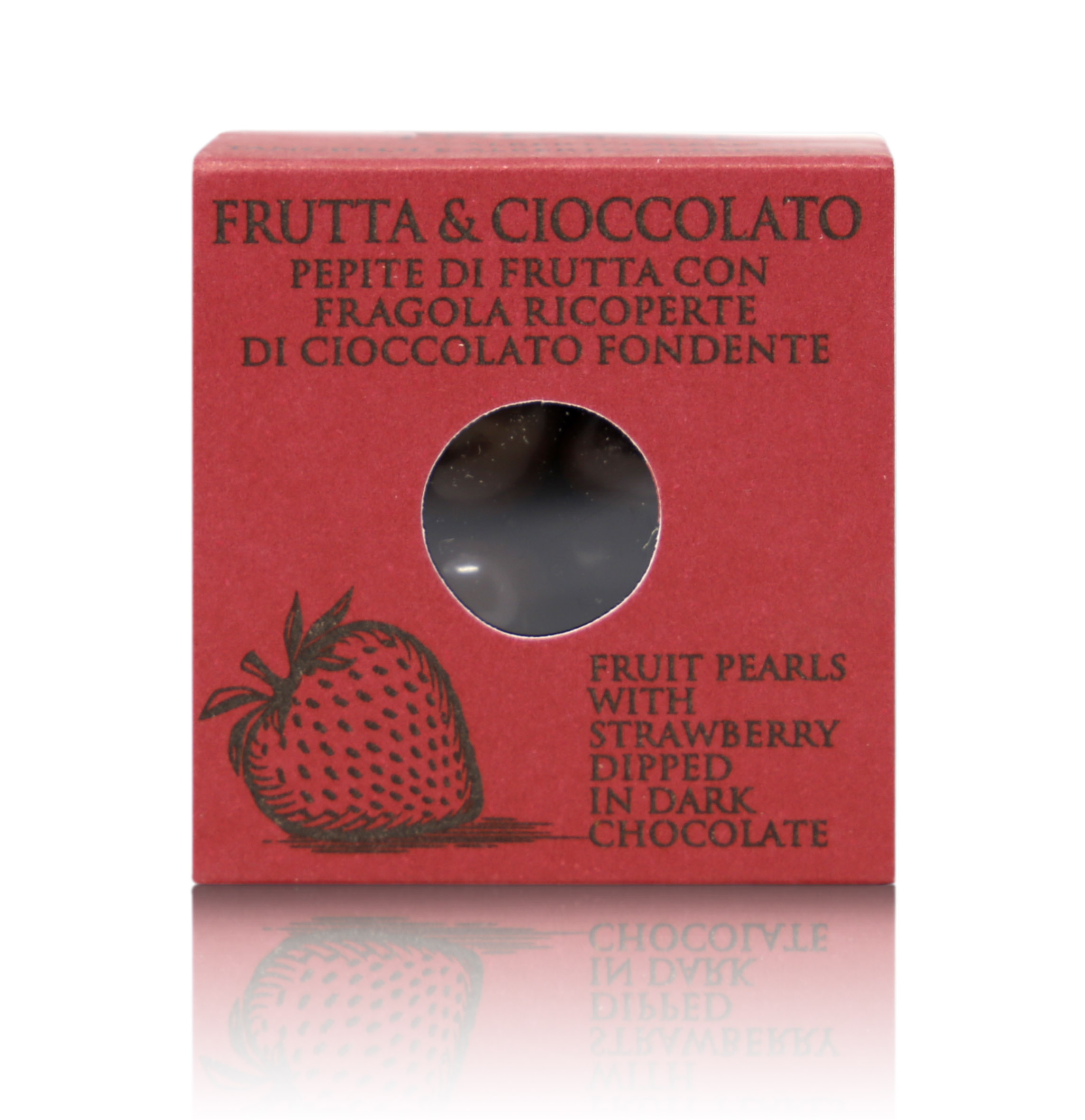 Una moderna confezione a forma di cubo, grazie ad alcuni lati trasparenti, lascia intravedere queste deliziose praline ricoperte di cioccolato fondente, che nascondono un cuore morbido di purea di fragola. Il cioccolato fondente usato per rivestire queste pepite di frutta è artigianale e contiene almeno il 66% di cacao.