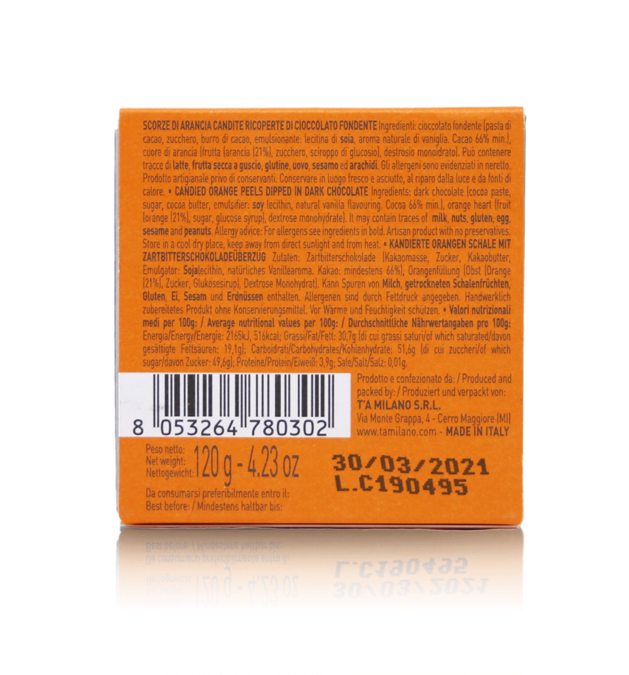 T'a Milano Scorza d'Arancia Candita Ricoperta di Cioccolato Fondente 66%, Praline di Frutta Candita, 120g