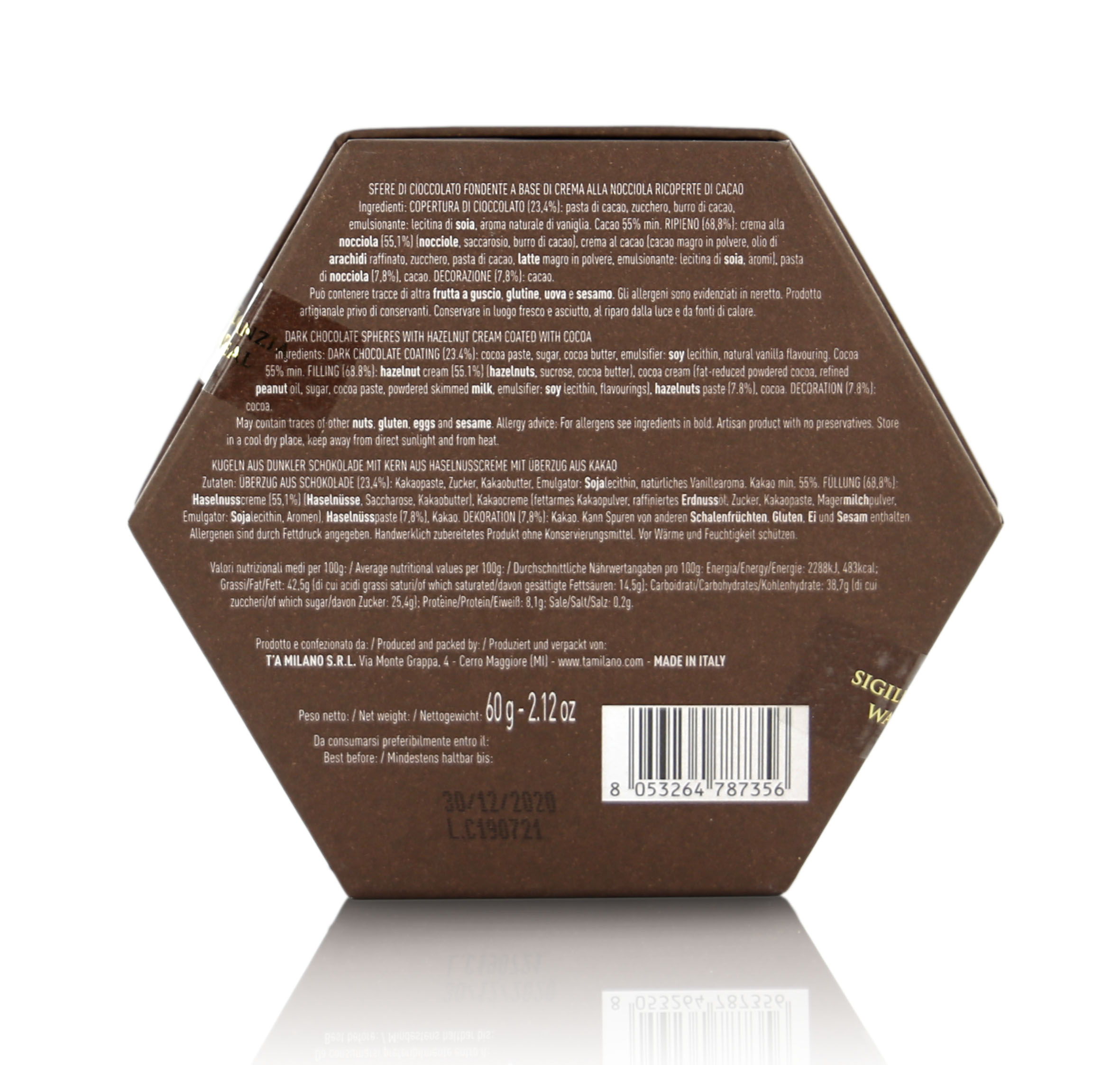 Una elegante confezione esagonale racchiude 7 tartufini al cioccolato fondente. Per mantenerne l'integrità e fare in modo che risaltino in tutta la loro bellezza, i tartufi sono riposti in appositi alloggiamenti sagomati. I tartufini sono realizzati con cioccolato fondente artigianale e un ripieno cremoso. L'esterno è ricoperto di cacao in polvere. Sono perfetti da offrire ai vostri ospiti insieme al caffè o come piccolo regalo per gli amanti dei dolci.