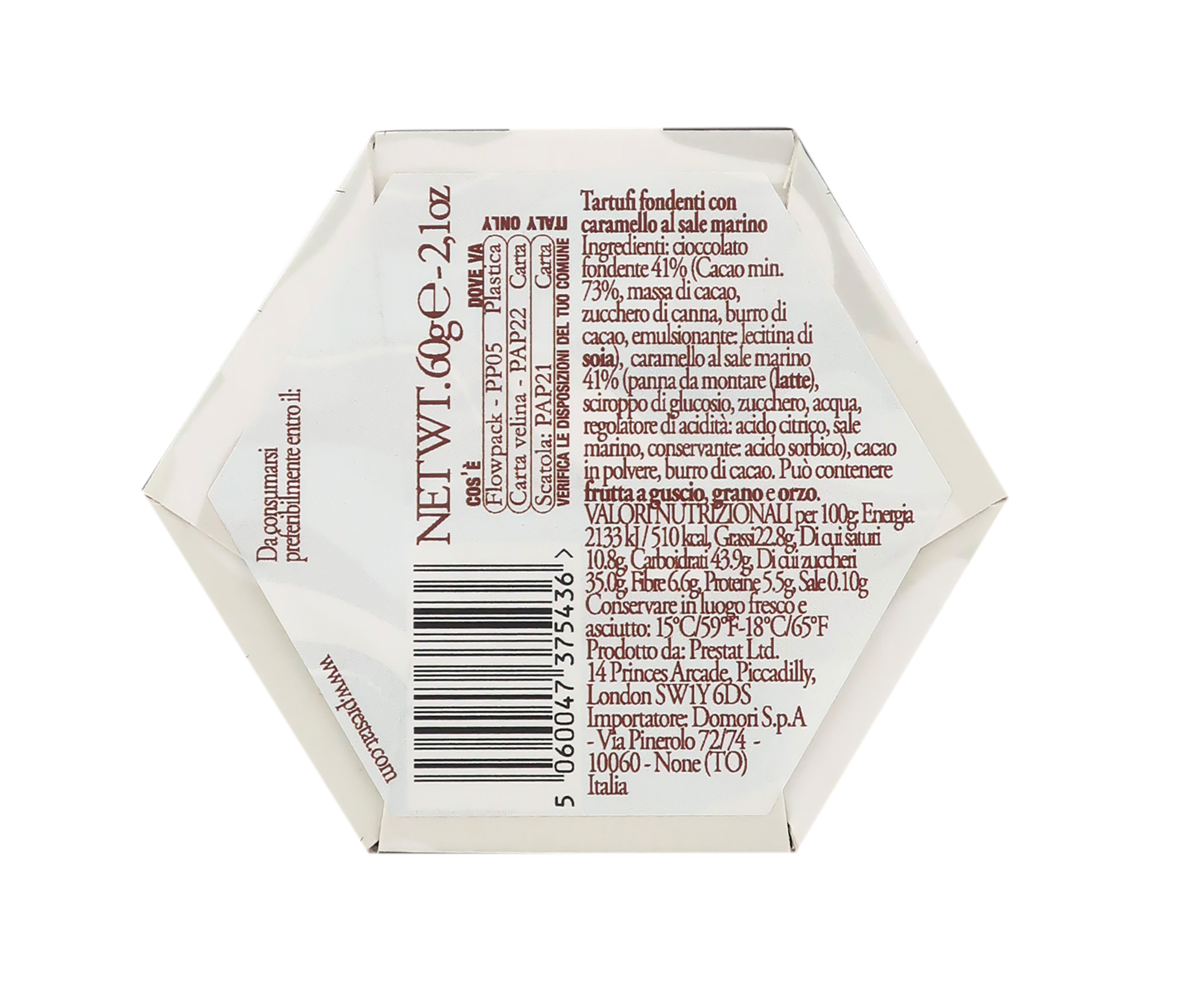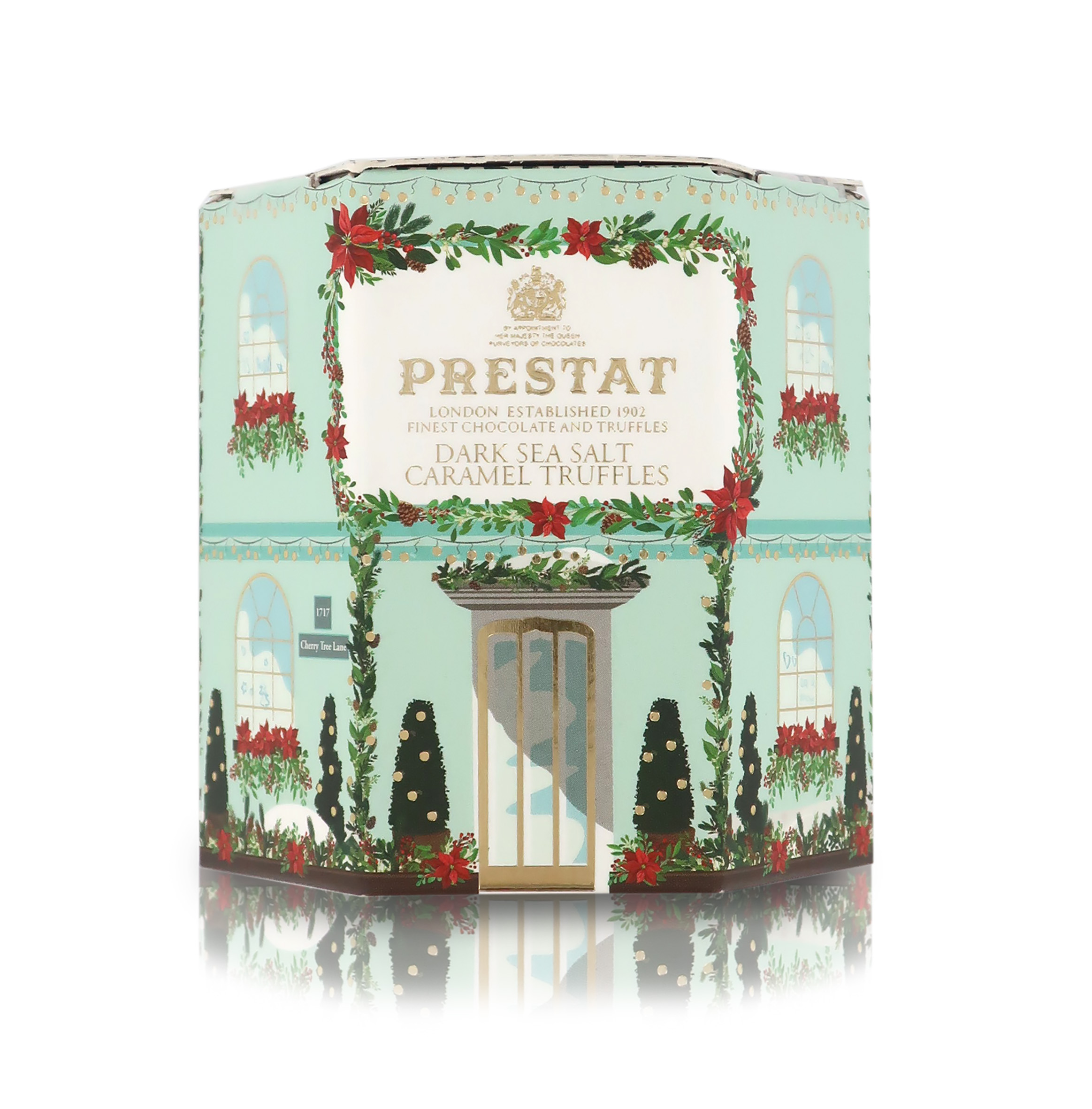 Iconici tartufi di cioccolato Prestat al caramello salato, in una graziosa scatoletta regalo illustrata che rende omaggio alle caratteristiche case londinesi addobbate a festa per il periodo natalizio. La piccola confezione regalo, di cartoncino leggero e dalla forma esagonale, vanta un piccolo manico sul tetto e contiene 60g di tartufi realizzati con una copertura di cioccolato fondente Domori (cacao min. 73%) e un cuore cremoso al caramello al sale. Perfetta come idea regalo da sola o in un cesto natalizio con altre specialità dolci. La linea completa “Case Festose”, da collezionare, include anche tartufi al London Gin e limone, tartufi al tè Earl Grey e tartufi al Pink Marc de Champagne.