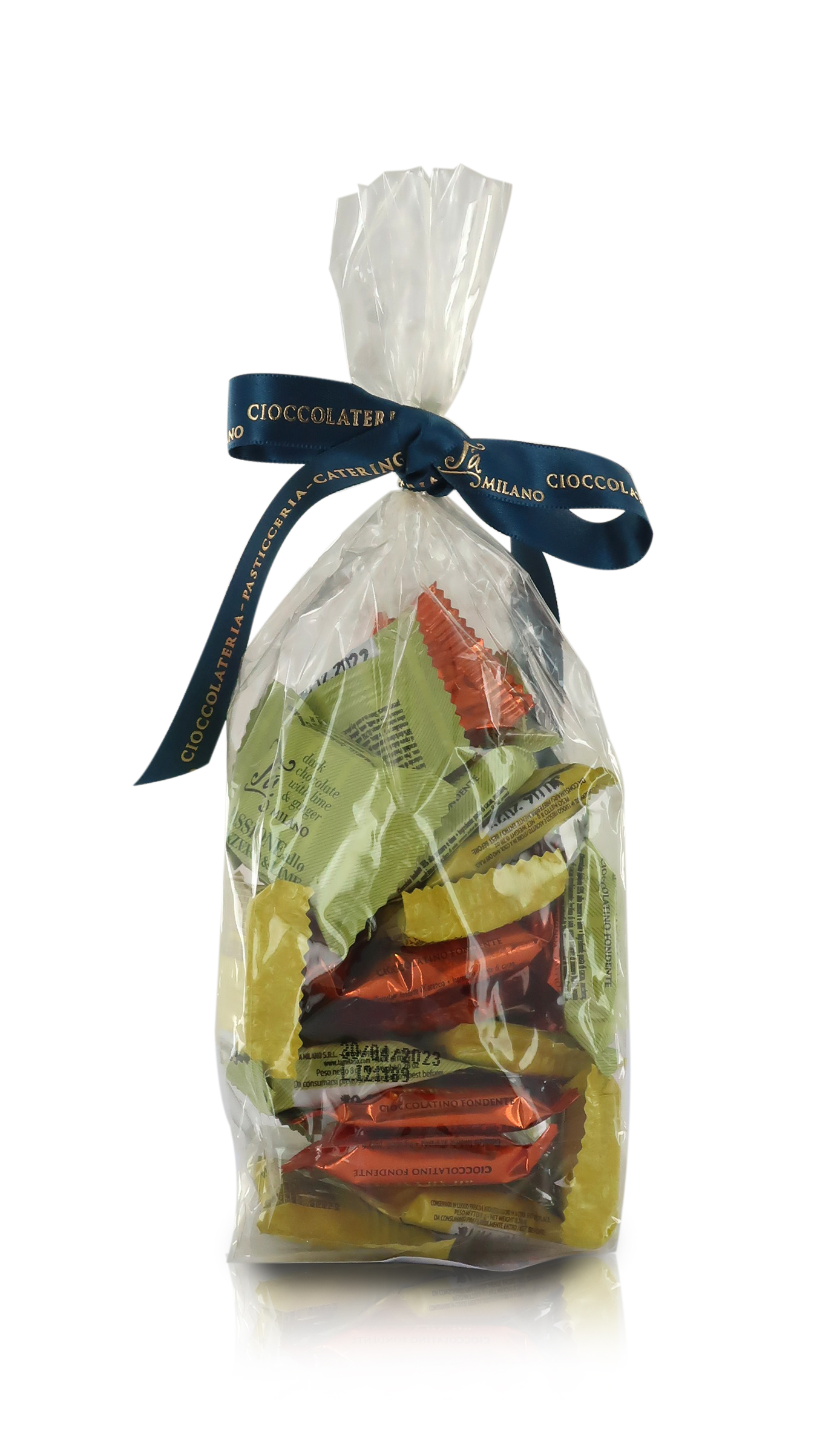 Sacchettino appartenente alla linea "I Piccoli Assaggi", con 24 cioccolatini artigianali "Napolitain" T'a Milano in gusti assortiti. I Napolitain, classici cioccolatini quadrati da 8g l'uno, vengono proposti nelle seguenti varianti:
