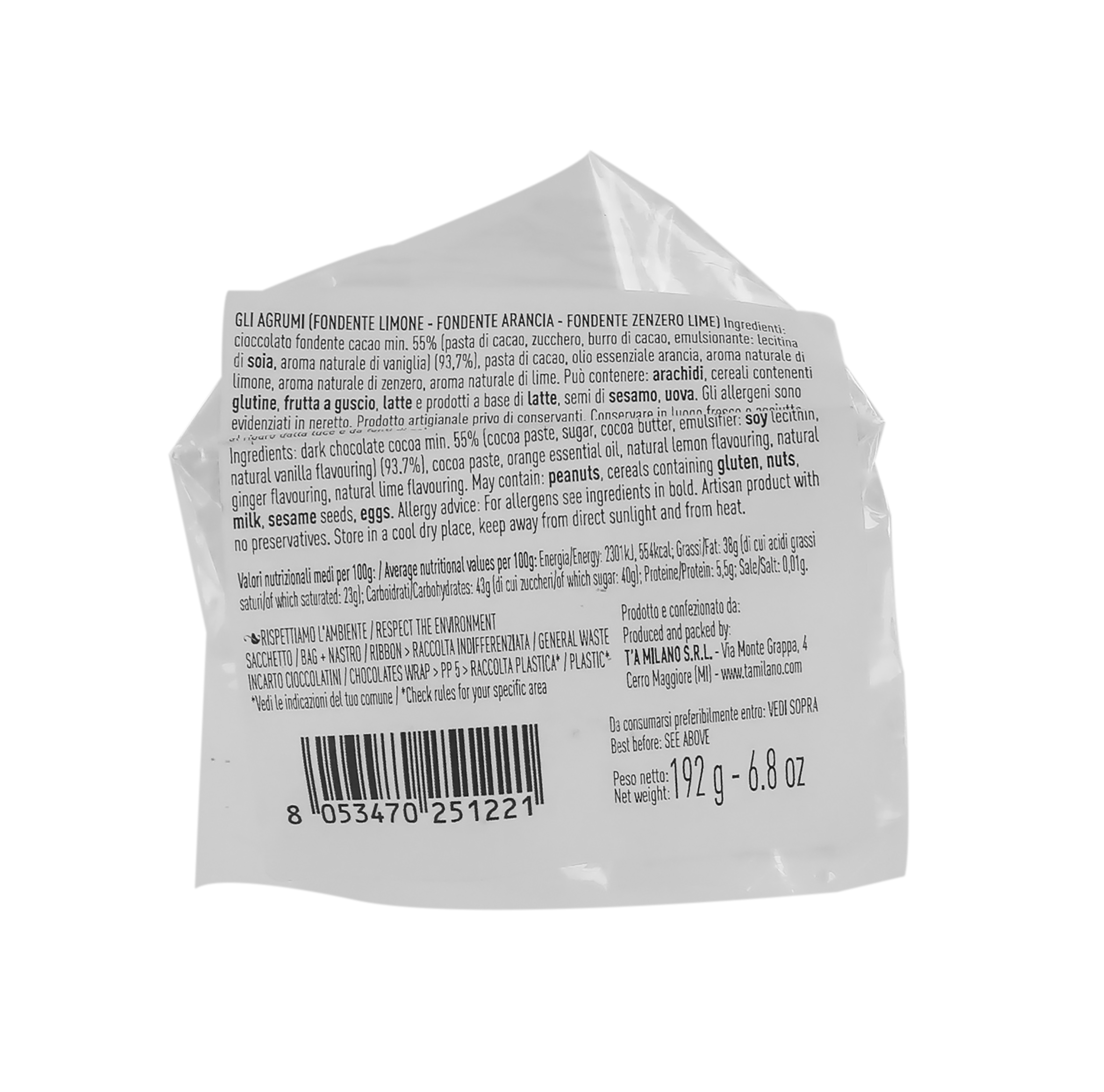 T'a Milano Sacchettino Assortito ''Gli Agrumi'' con Napolitains in 3 Gusti, Cioccolato Artigianale Prodotto in Italia, 24 Pz, 192 Grammi