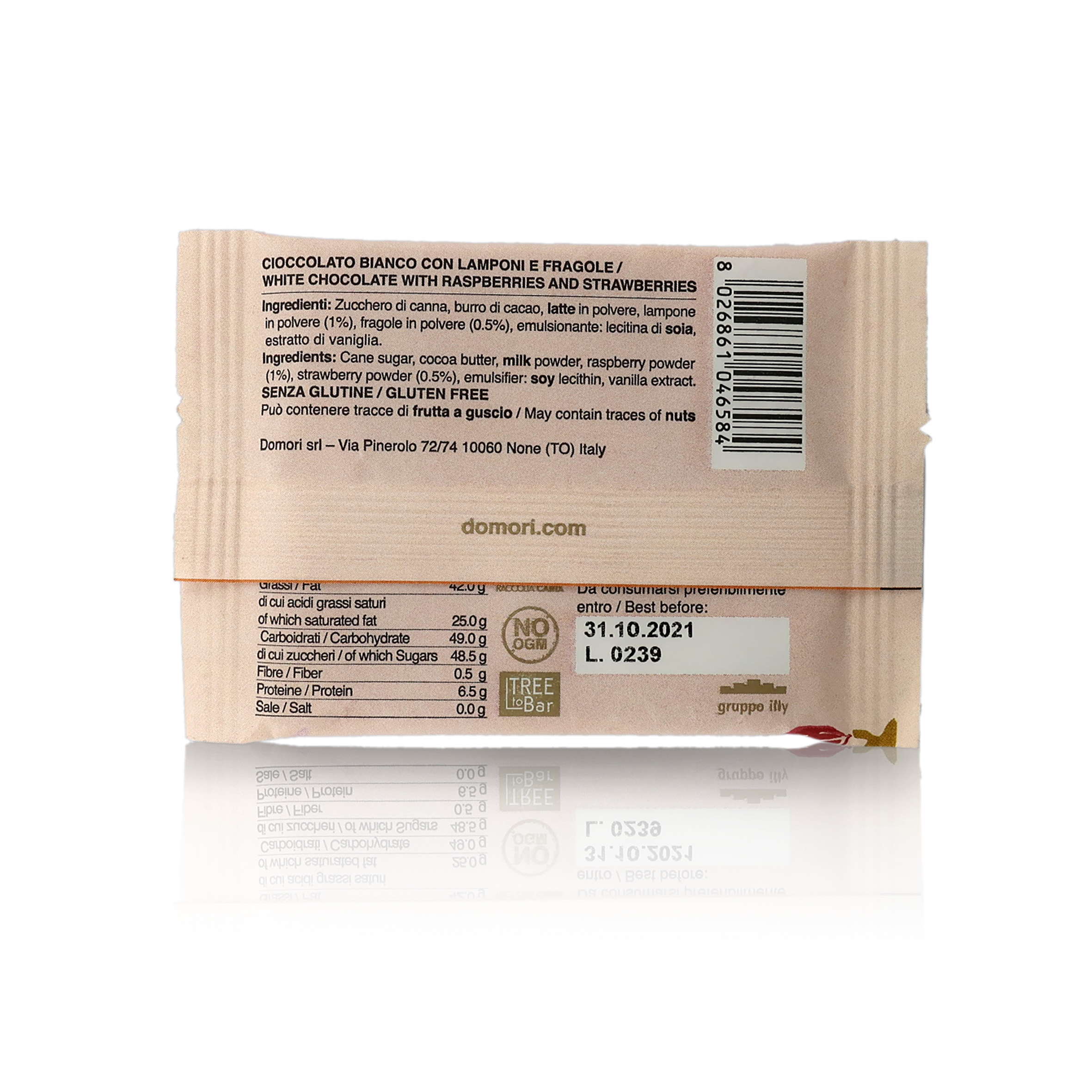 La confezione (flowpack) di questa tavoletta di cioccolato bianco con frutti rossi, come per tutta la linea dei prodotti Domori To Go, è una confezione leggera, pratica ed ecosostenibile, essendo smaltibile insieme alla carta.