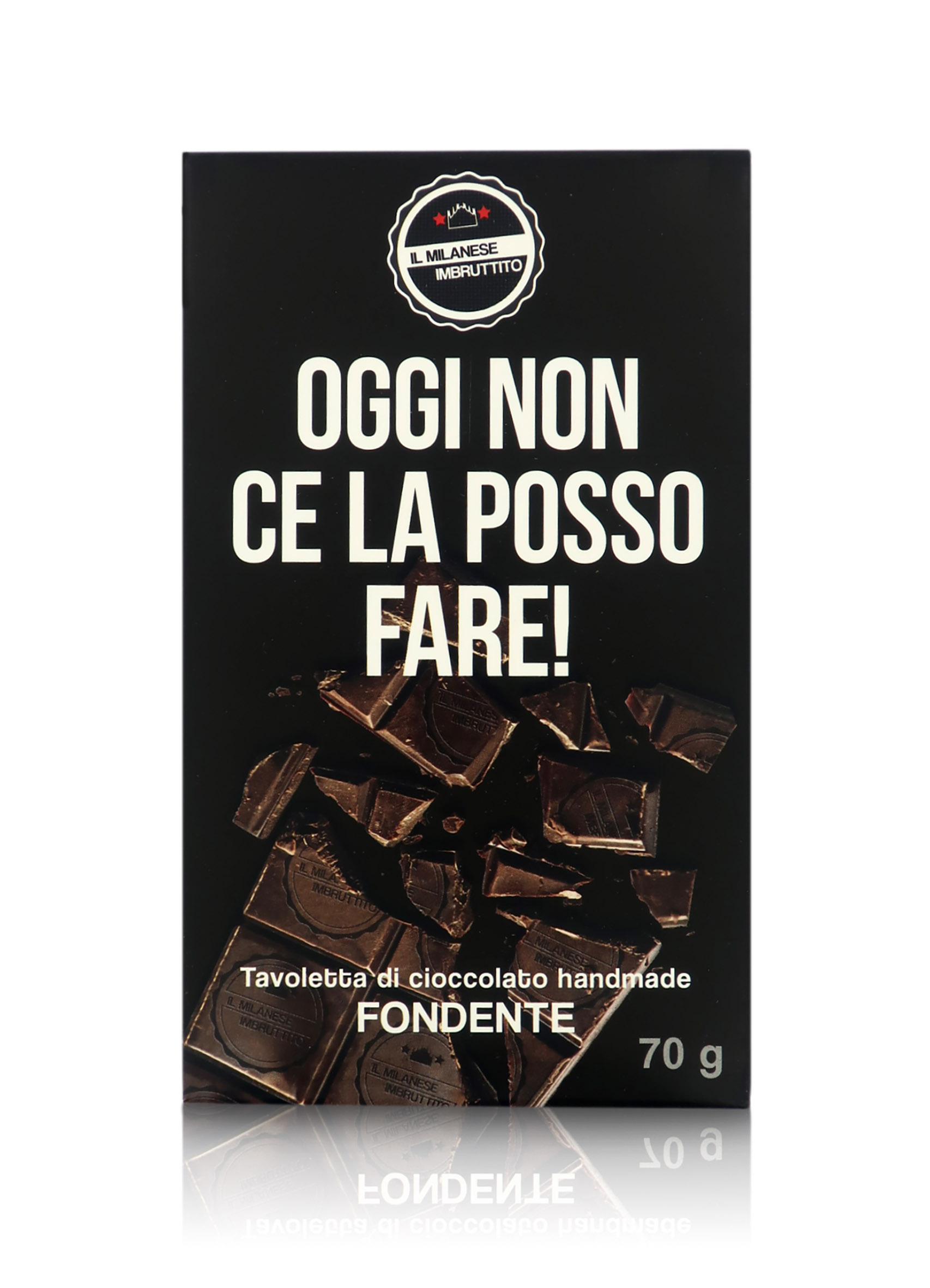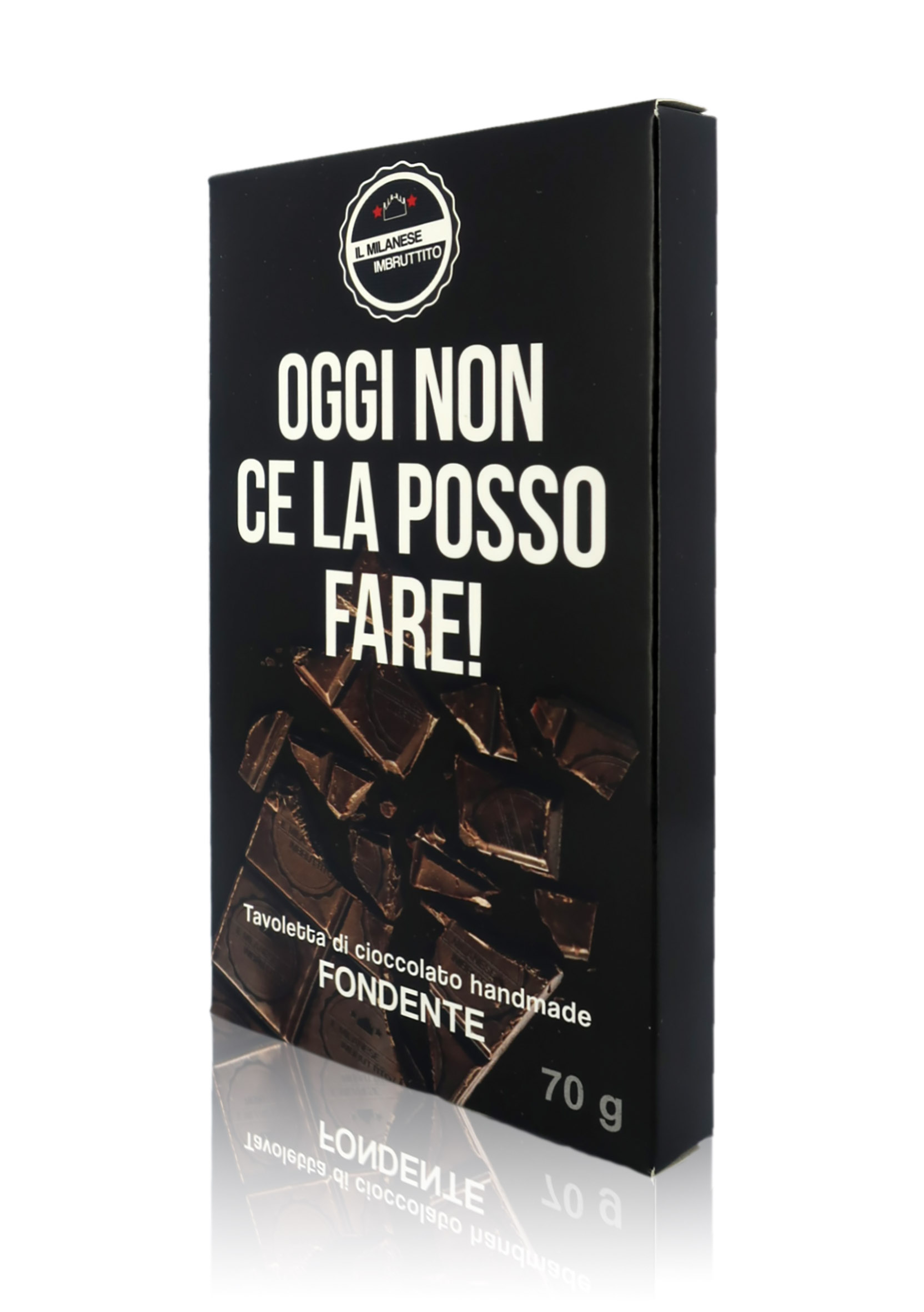4 tavolette di cioccolato fondente fatte a mano del Milanese Imbruttito, con gli iconici modi di dire milanesi "Oggi non ce la posso fare"e "Chi va piano non è di Milano". Peso netto tot. 280 grammi.