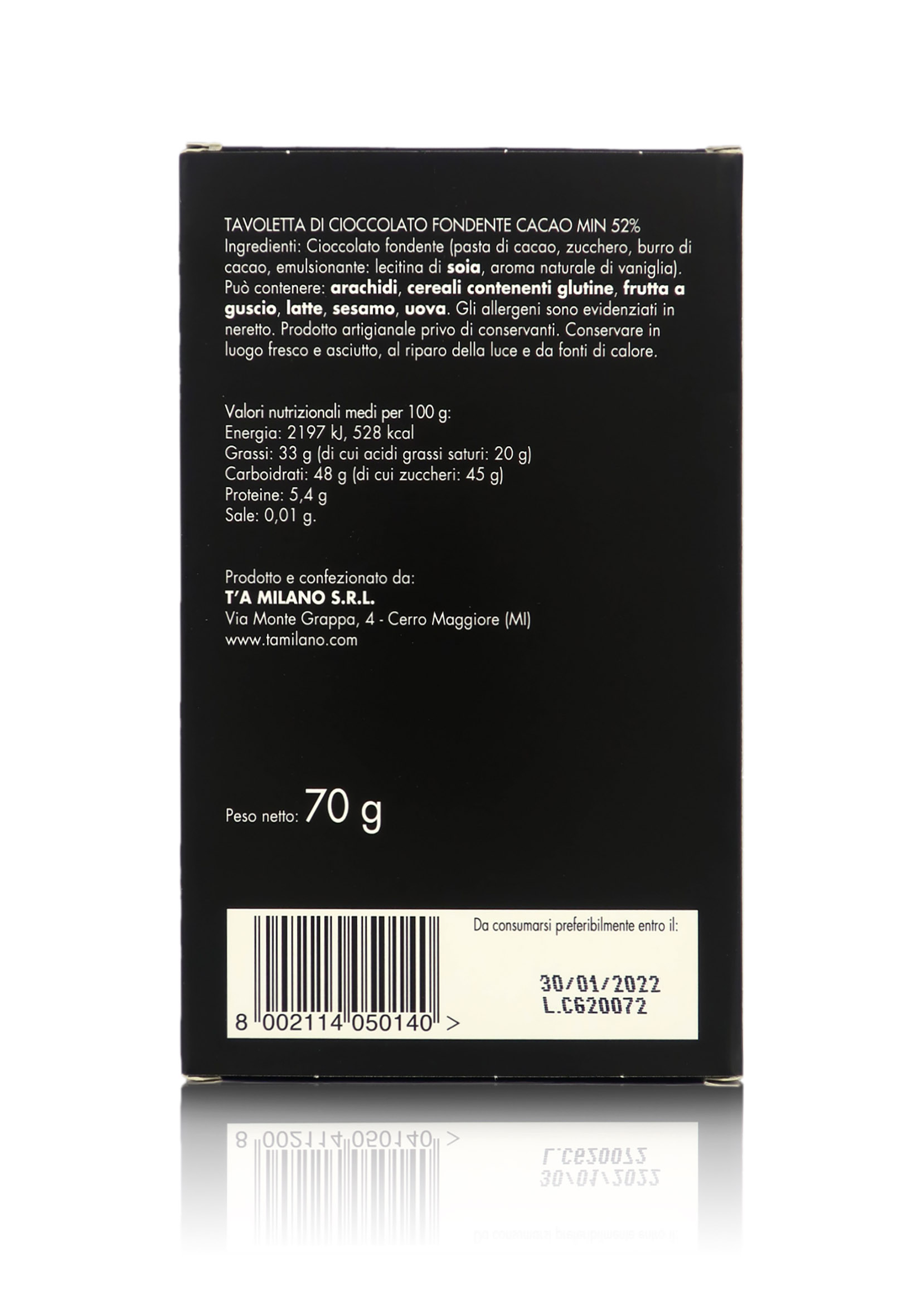 Ingredienti: cioccolato fondente (pasta di cacao, zucchero, burro di cacao, emulsionante: lecitina di SOIA, aroma naturale di vaniglia).