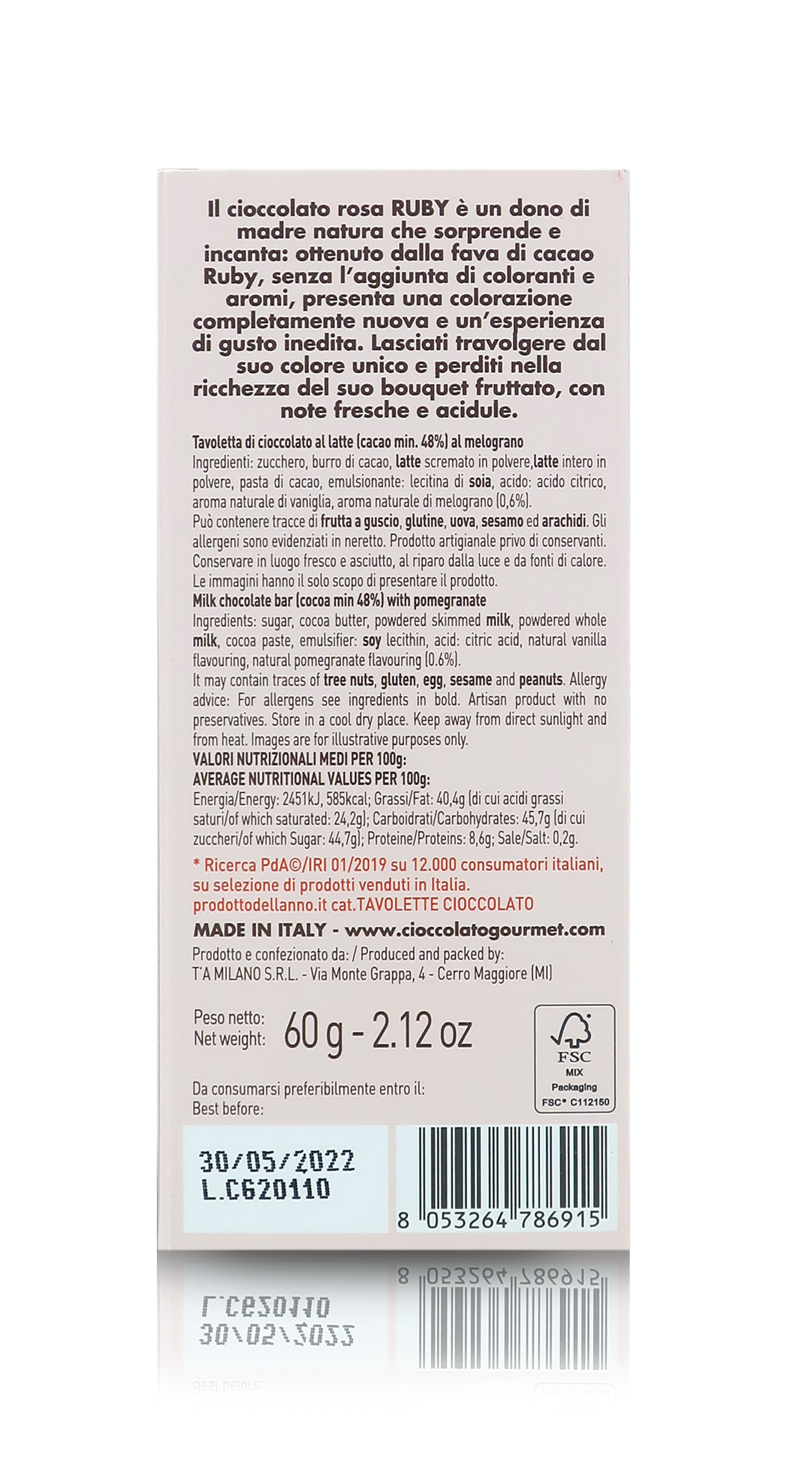 Una tavoletta di cioccolato dal colore unico e dal ricco bouquet fruttato, con note fresche e acidule. Il cioccolato rosa "ruby" è un dono di madre natura: ottenuto dalla fava di cacao Ruby, senza l’aggiunta di coloranti e aromi, presenta una colorazione completamente nuova e un'esperienza di gusto inedita, da scoprire quadratino dopo quadratino. Peso netto: 60g. Aromatizzazione: melograno. Le tavolette "Cioccolato Gourmet" di T'a Milano sono caratterizzate da contrasti di sapori innovativi e sorprendenti, espressione di una sofisticata evoluzione del gusto. Sono state elette "Prodotto dell’Anno" 2019 e sono state premiate agli International Chocolate Awards 2020.