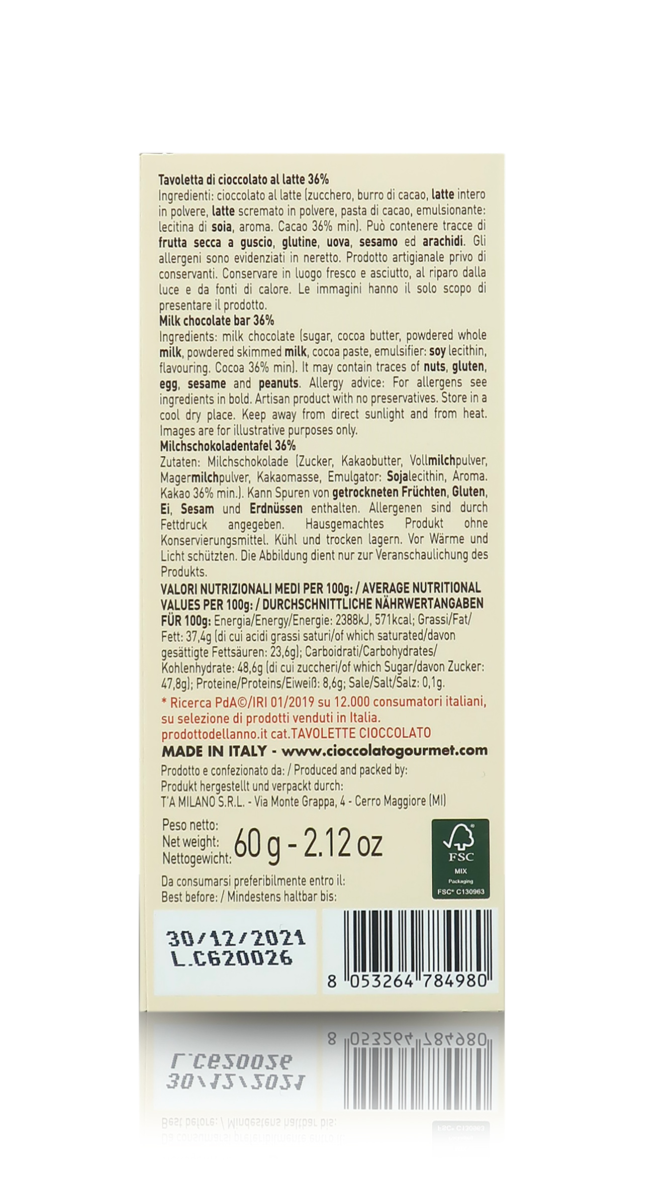 Ingredienti: Cioccolato al LATTE (zucchero, burro di cacao, LATTE intero in polvere, LATTE scremato in polvere, pasta di cacao, emulsionante: lecitina di SOIA, aroma. Cacao 36% min). Può contenere tracce di FRUTTA SECCA A GUSCIO, GLUTINE, UOVA, SESAMO e ARACHIDI. Valori nutrizionali medi per 100g: 2388kJ, 571kcal; Grassi: 37,4g (di cui acidi grassi saturi: 23,6g); Carboidrati: 48,6g (di cui zuccheri: 47,8g); Proteine: 8,6g; Sale: 0,1g.