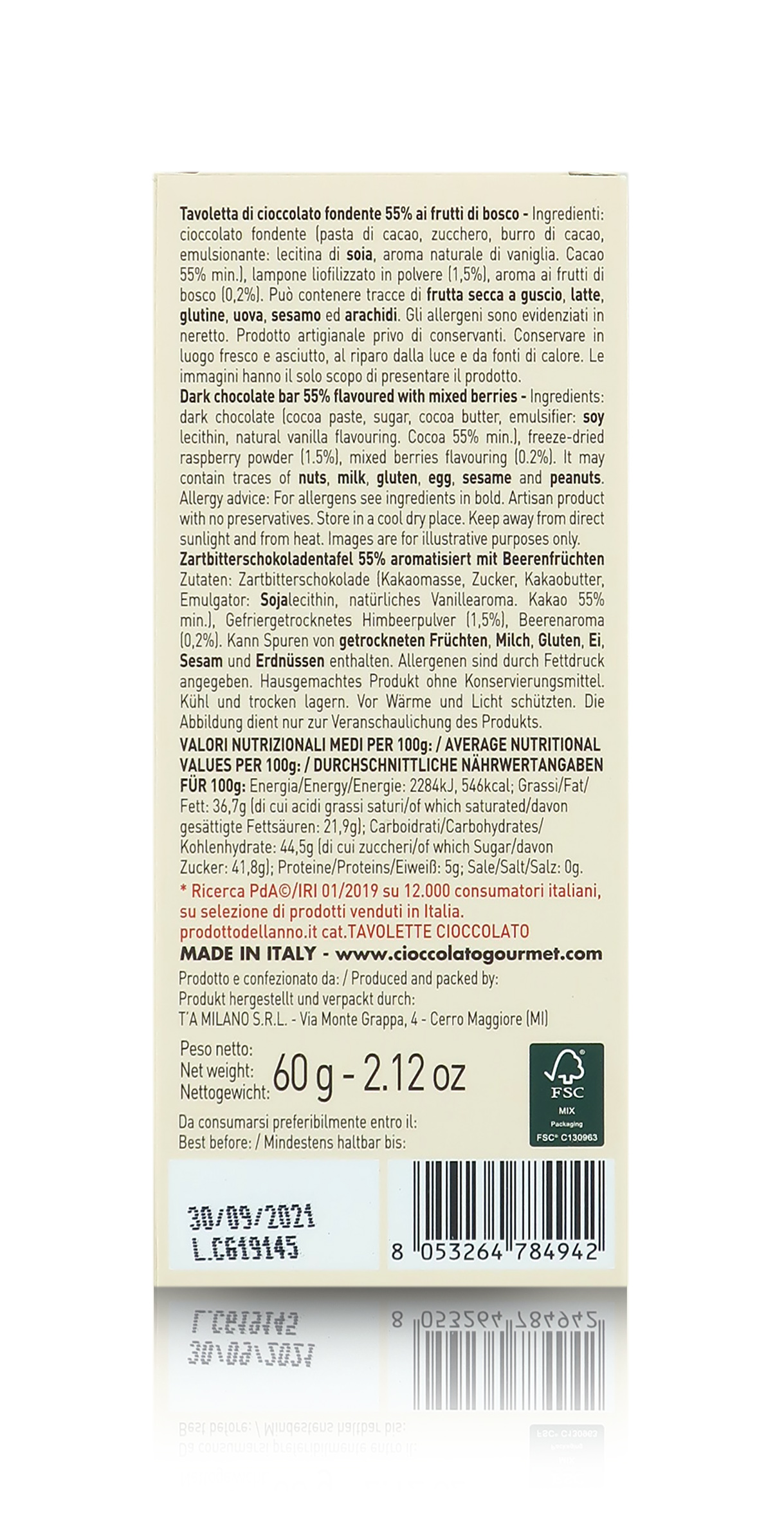L'intensità del cioccolato fondente 55% si unisce alla dolcezza dei frutti di bosco, dando vita a un abbinamento insolito e intrigante, dal gusto inatteso al palato, in formato tavoletta da 60g.