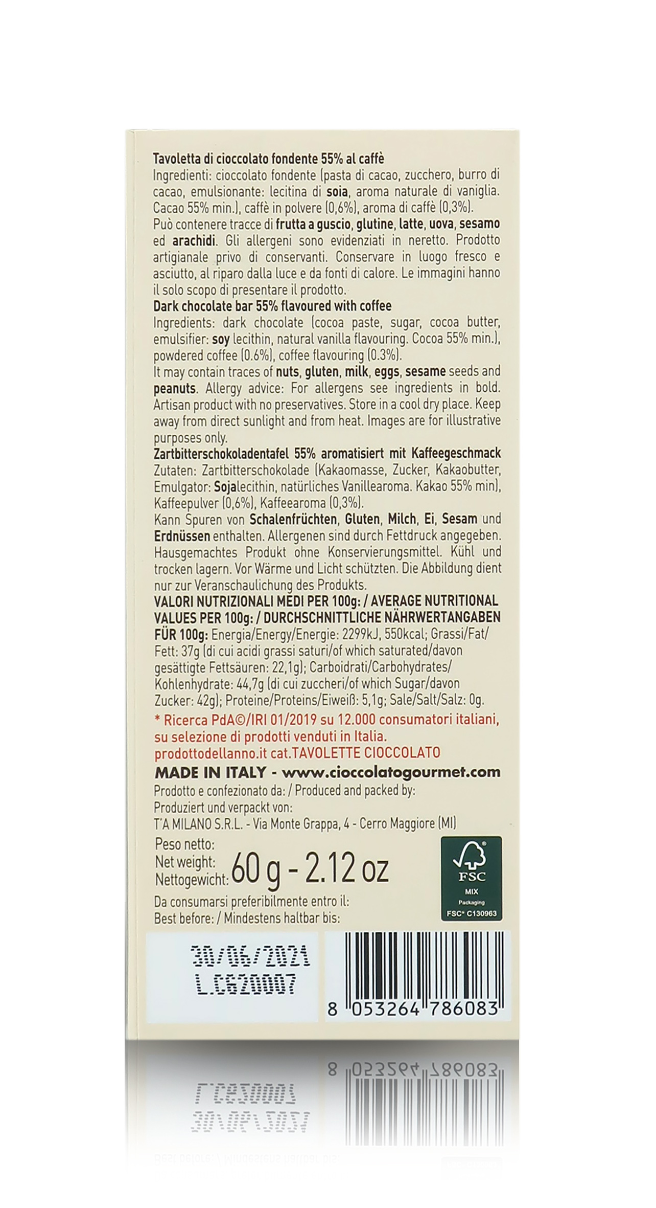Ingredienti: Cioccolato fondente (pasta di cacao, zucchero, burro di cacao, emulsionante: lecitina di SOIA, aroma naturale di vaniglia. Cacao 55% min.), caffè in polvere (0,6%), aroma di caffè (0,3%). Può contenere tracce di FRUTTA A GUSCIO, GLUTINE, LATTE, UOVA, SESAMO e ARACHIDI. Valori nutrizionali medi per 100g: 2299kJ, 550kcal; Grassi: 37g (di cui acidi grassi saturi: 22,1g); Carboidrati: 44,7g (di cui zuccheri: 42g); Proteine: 5,1g; Sale: 0g.