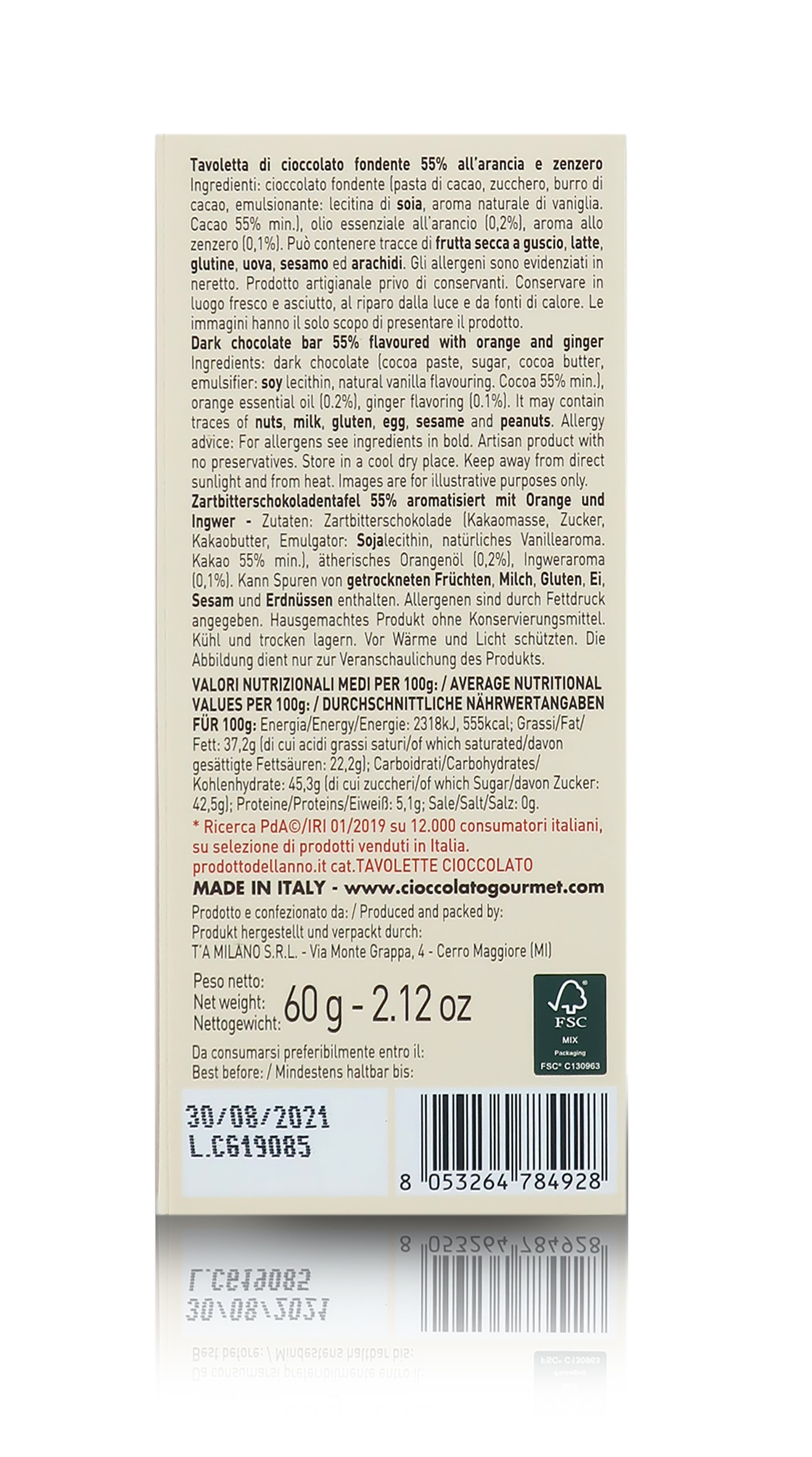 Ingredienti: Cioccolato fondente (pasta di cacao, zucchero, burro di cacao, emulsionante: lecitina di SOIA, aroma naturale di vaniglia. Cacao 55% min.), olio essenziale all’arancio (0,2%), aroma allo zenzero (0,1%). Può contenere tracce di FRUTTA SECCA A GUSCIO, LATTE, GLUTINE, UOVA, SESAMO e ARACHIDI. Valori nutrizionali medi per 100g: 2318kJ, 555kcal; Grassi: 37,2g (di cui acidi grassi saturi: 22,2g); Carboidrati: 45,3g (di cui zuccheri: 42,5g); Proteine: 5,1g; Sale: 0g.