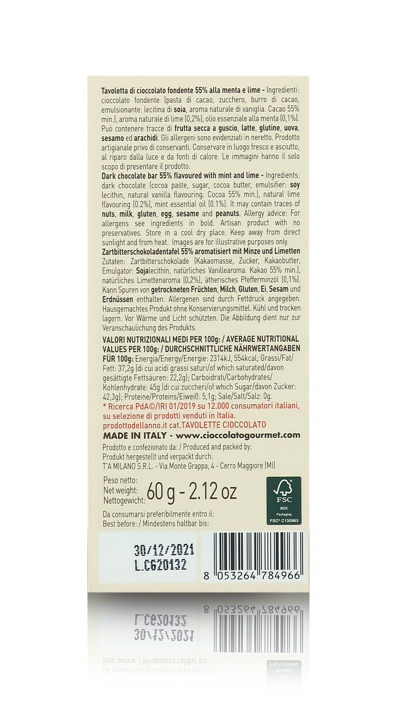 L'intensità del cioccolato fondente 55% si unisce all'aromaticità penetrante della menta e alla nota agrumata del lime, dando vita ad accostamenti gustativi insoliti e intriganti, in formato tavoletta da 60g.