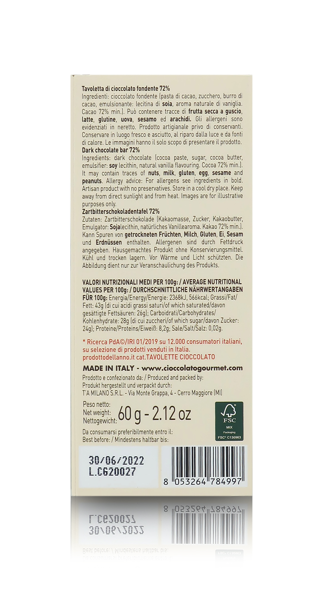 La classicità del cioccolato fondente 72% in formato tavoletta da 60g: un cacao aromatico dal sapore intenso e persistente.