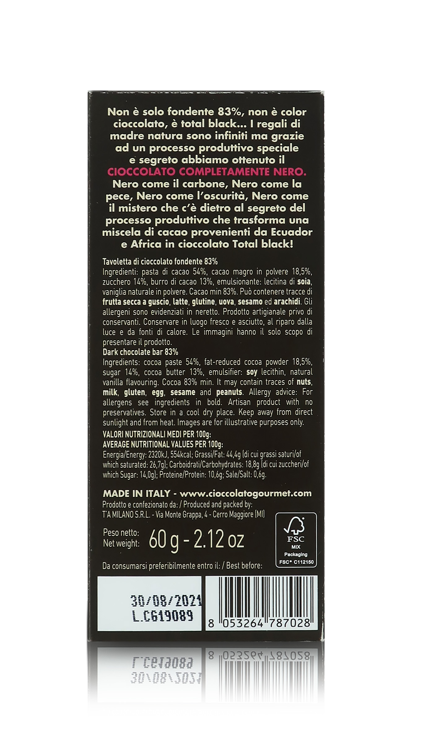 La classicità del cioccolato fondente 83% in formato tavoletta da 60g: una tavoletta non color cioccolato, bensì "total black", dalla scurissima colorazione nera donata dalla natura grazie a un processo di lavorazione molto particolare e segreto! Questa tavoletta molto particolare, che rappresenta una apprezzatissima idea regalo per gli amanti del cioccolato, è realizzata con una miscela di cacao dell'Ecuador e dell'Africa. Le tavolette "Cioccolato Gourmet" sono espressione di una sofisticata evoluzione del gusto. Sono state elette "Prodotto dell’Anno" 2019 e sono state premiate agli International Chocolate Awards 2020.