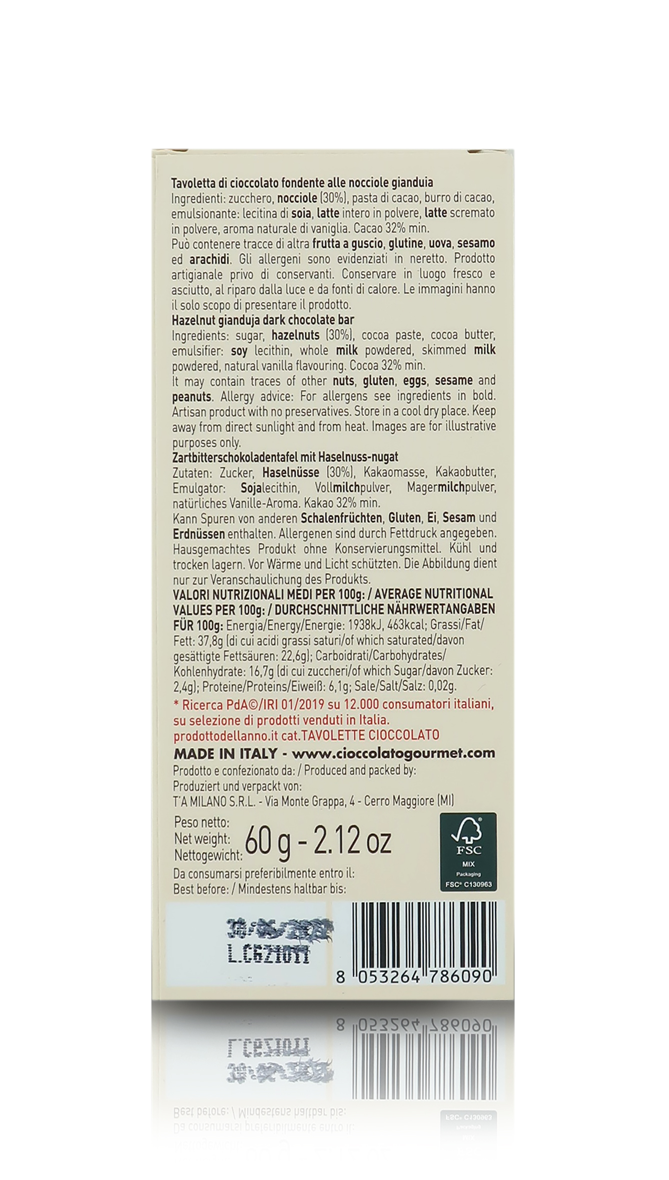 Una versione di cioccolato fondente al gianduia, in formato tavoletta da 60g; un cioccolato in cui il gusto rotondo della nocciola è protagonista.