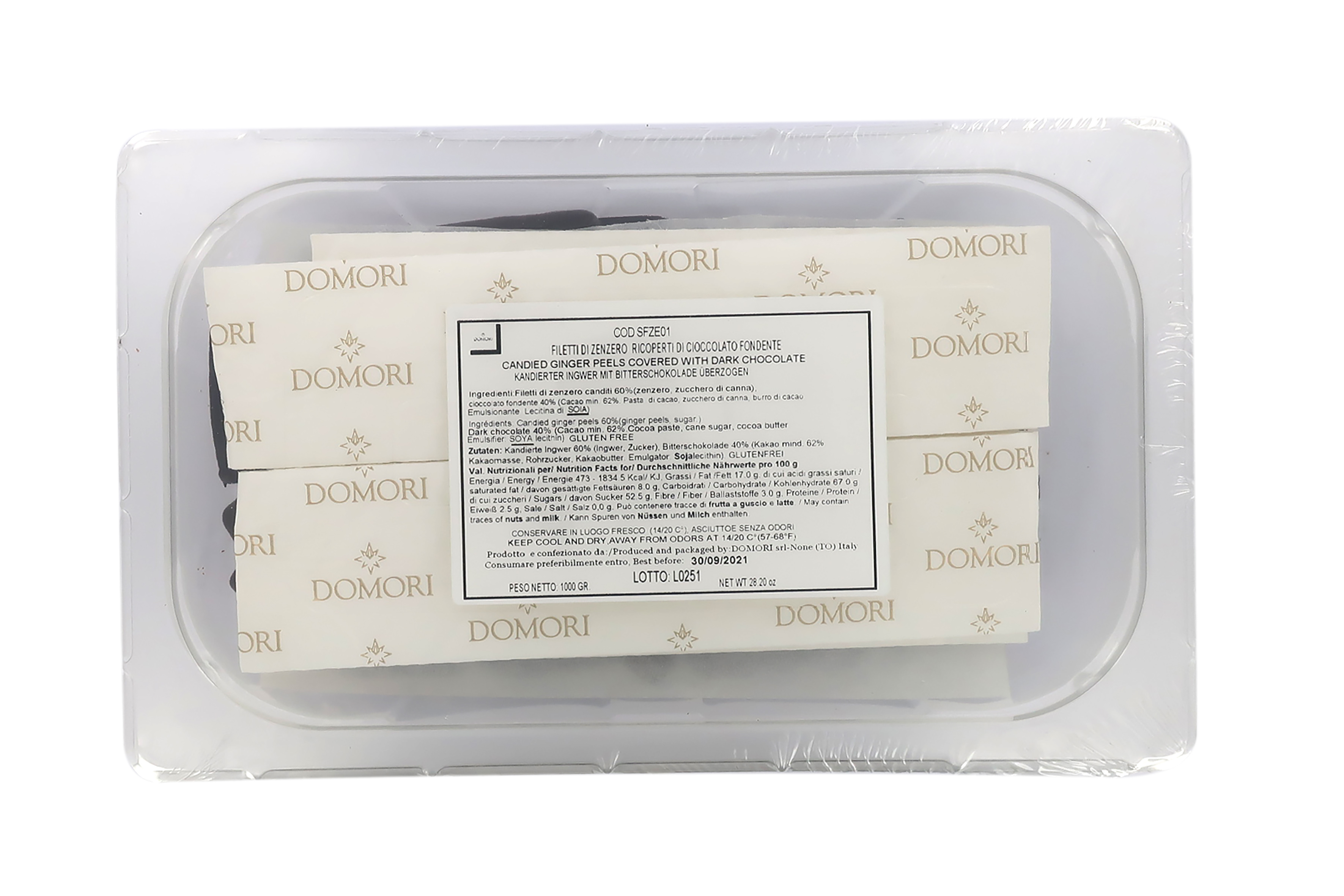 Filetti di zenzero candito incontrano le note aromatiche del cacao Domori, grazie alla copertura di pregiato cioccolato fondente. Perfette a fine pasto, da servire insieme al caffè o a una selezione di distillati. In vaschetta sigillata.