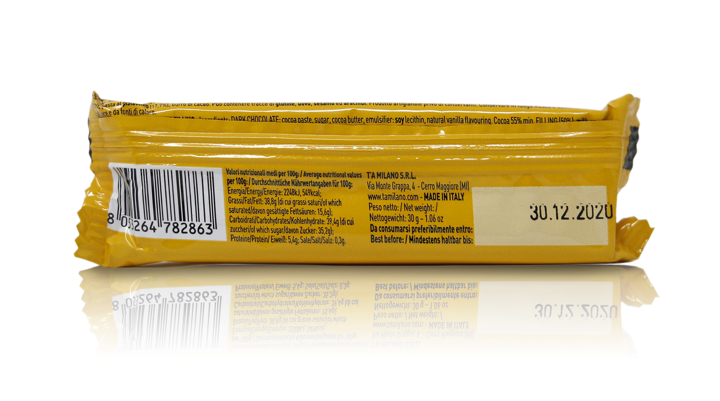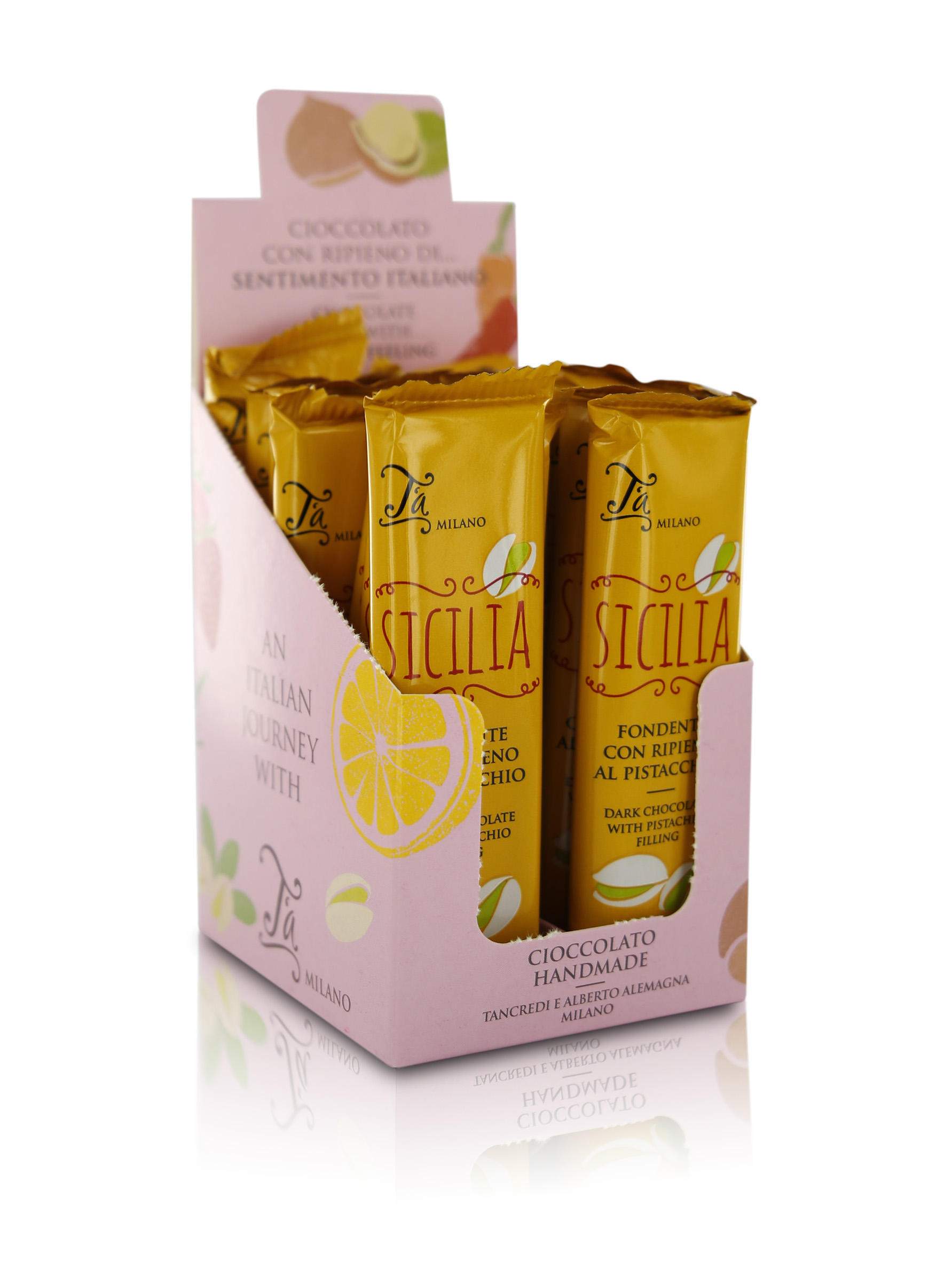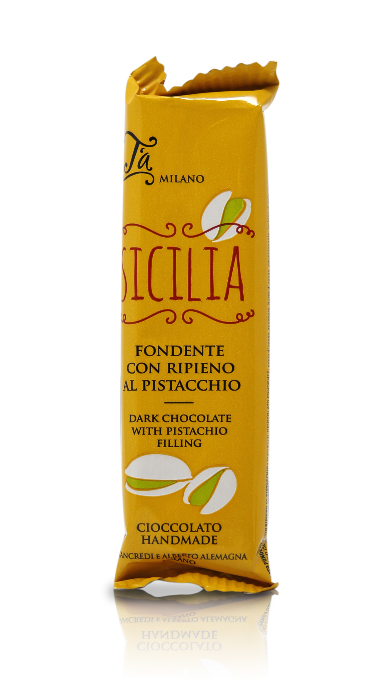 Tavoletta di cioccolato fondente da 30g che celebra la Sicilia. Contenuta in una pratica e colorata confezione, questa gustosa, piccola tavoletta di cioccolato fondente con cacao min. 55% è arricchita da un ripieno al pistacchio. La linea delle tavolette di cioccolato T’a Milano, che nasce dall'incontro tra cioccolato pregiato e diversi prodotti tipici della nostra penisola, è un piacevolissimo viaggio, in cui i vari gusti delle tavolette rappresentano le tappe di un itinerario che ci porta alla scoperta delle eccellenze italiane.