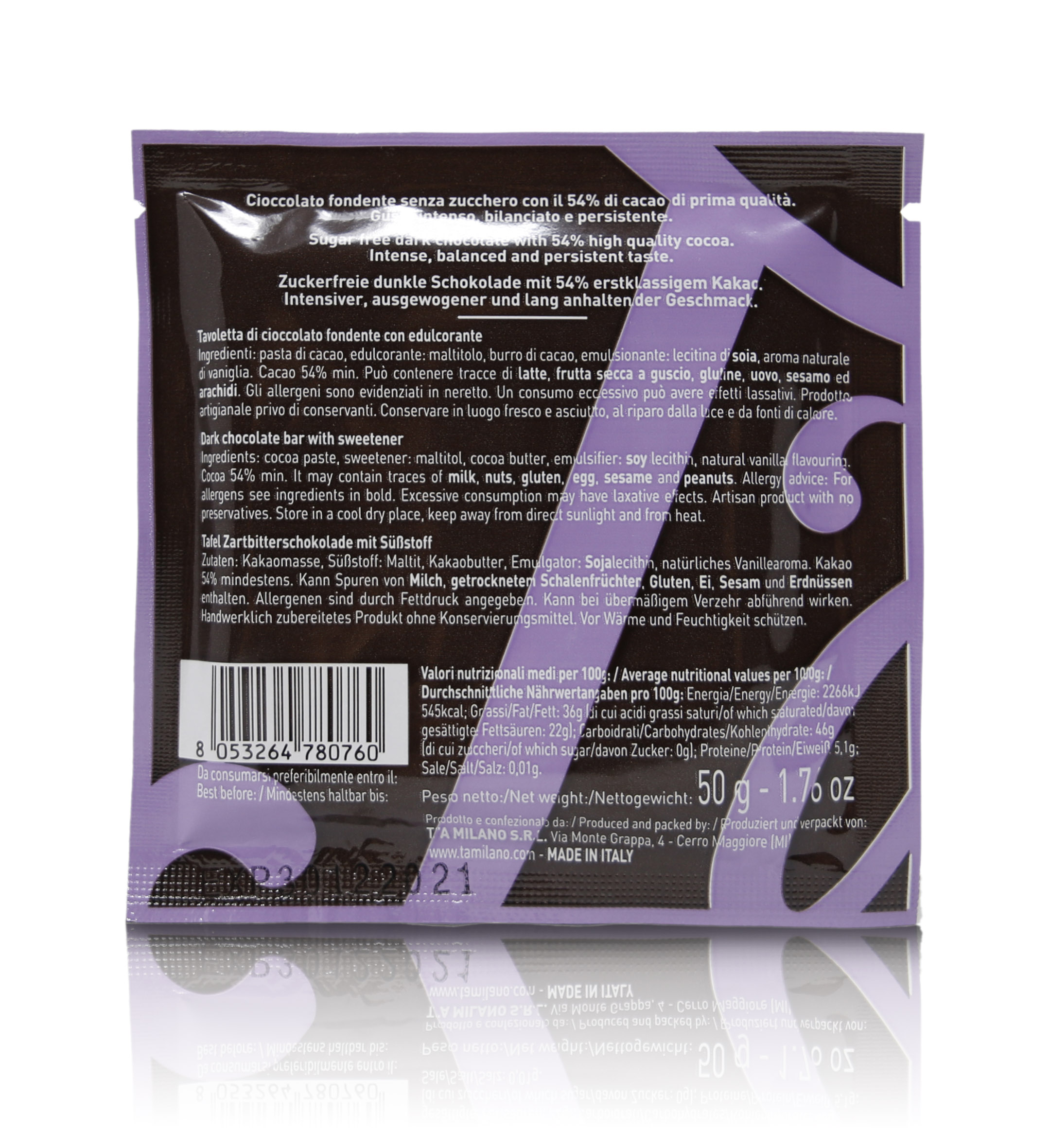 T'a Milano Tavoletta di cioccolato fondente 54% senza zucchero - 50g
