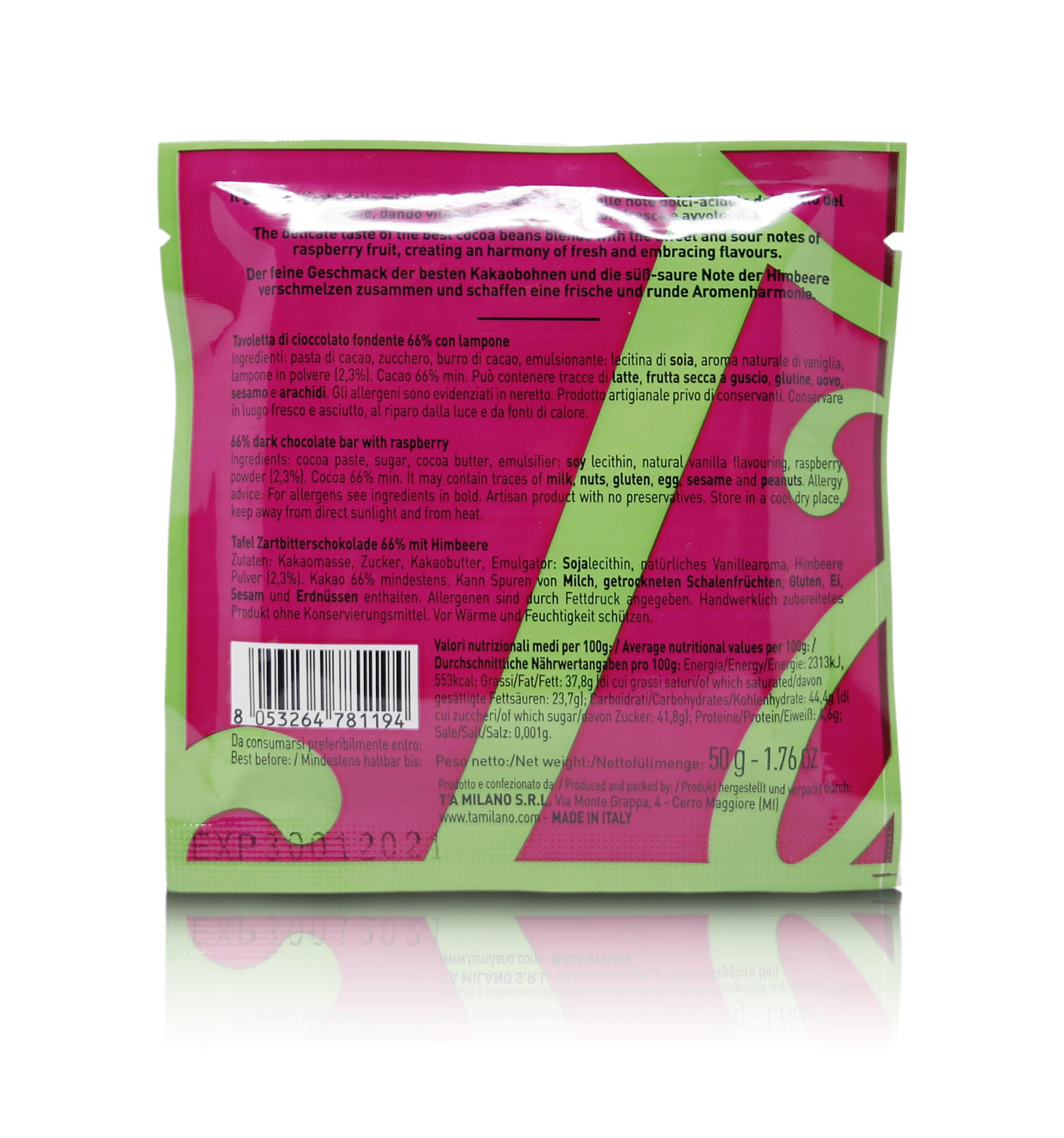 T'a Milano Tavoletta di cioccolato fondente 66% al lampone - 50g