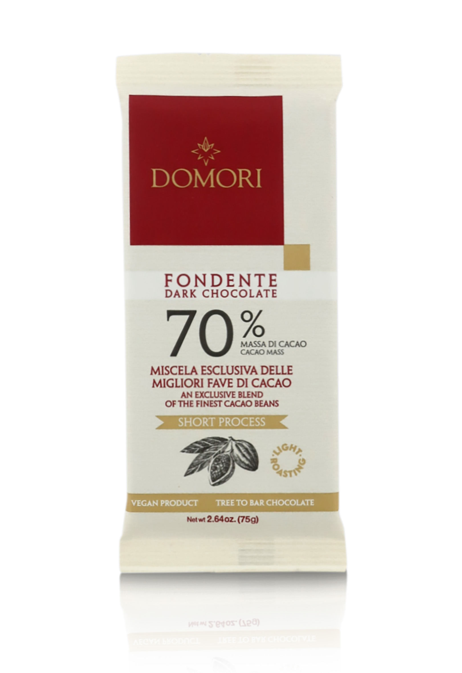 Blend di cacao Domori 70% in tavoletta da 75g. La confezione ecosostenibile racchiude l'aroma e il gusto del finissimo e aromatico cacao Criollo Domori. Una tavoletta di pregiato fondente, caratterizzato da un aroma di datteri, cereali e crema di LATTE.