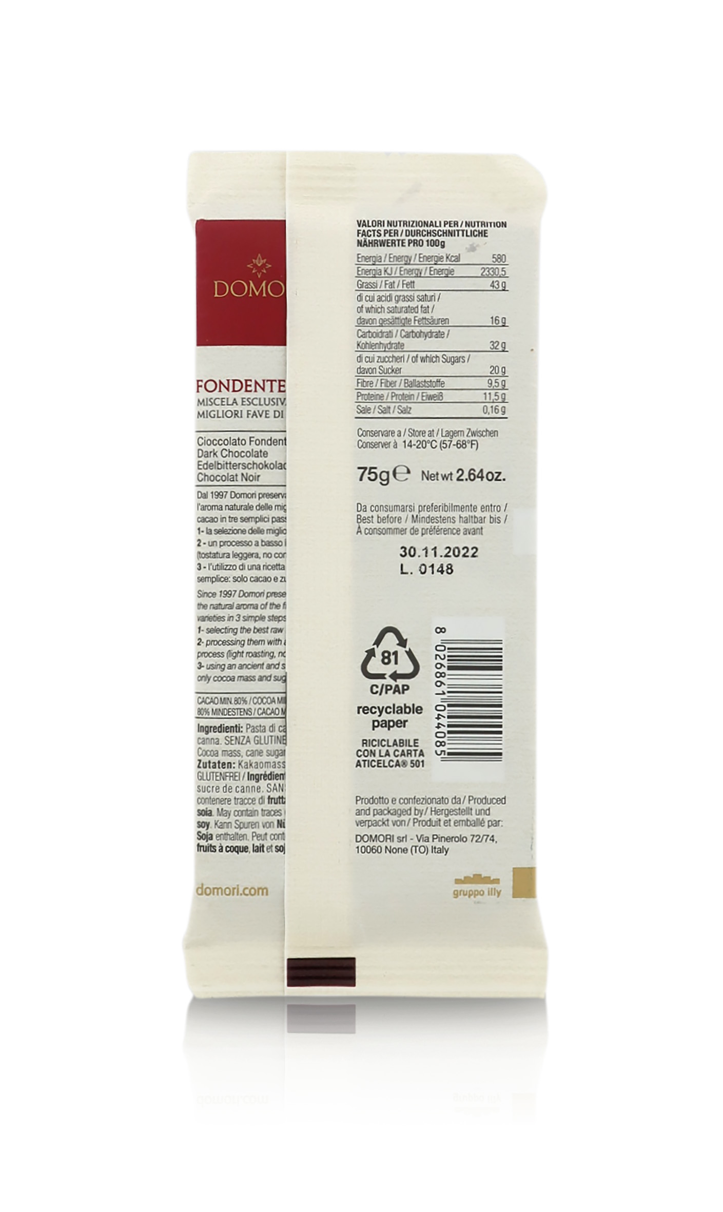 Blend di cacao Trinitario Domori 80% in tavoletta da 75g. La confezione ecosostenibile racchiude l'aroma e il gusto del finissimo cacao Domori. Una tavoletta di pregiato fondente, caratterizzato da un aroma netto e deciso, con note più delicate di frutta agrumata e fiori bianchi. Ottima in abbinamento a un buon caffè.