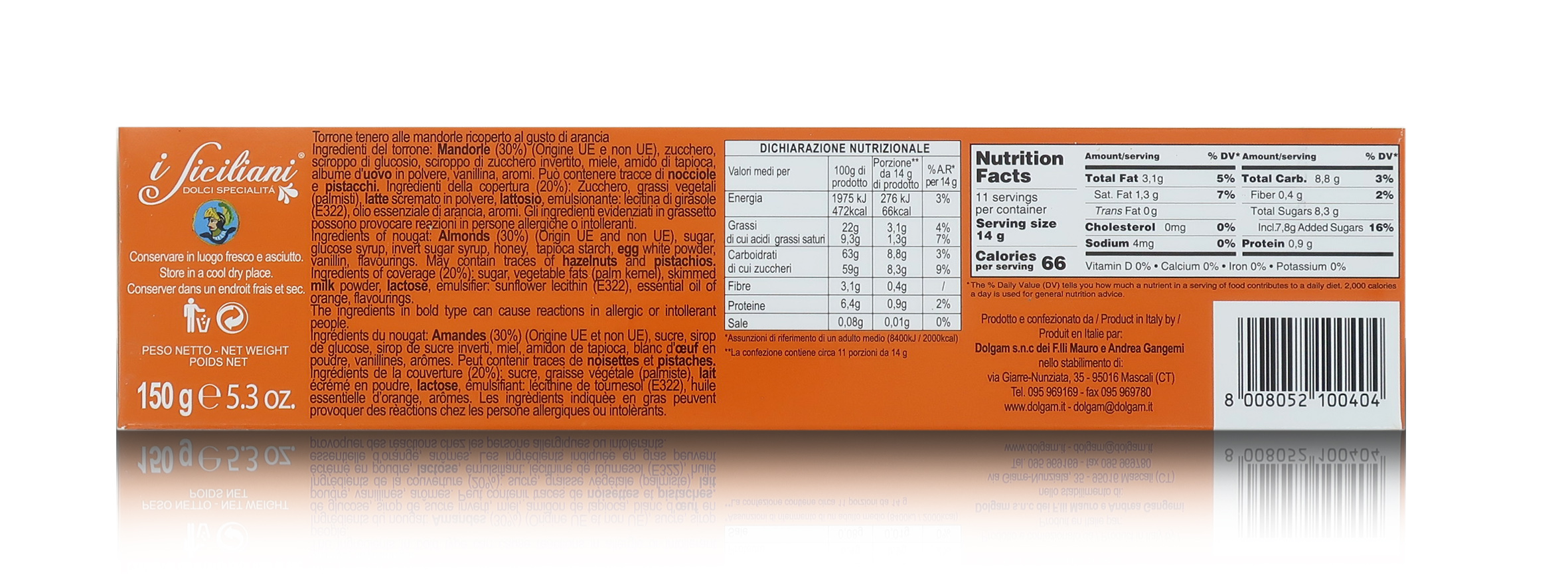 Torrone Morbido Alle Mandorle, 28 Stecche Di Torrone Tenero Ricoperto All'Arancia, ''I Siciliani", 28 x 150 Grammi