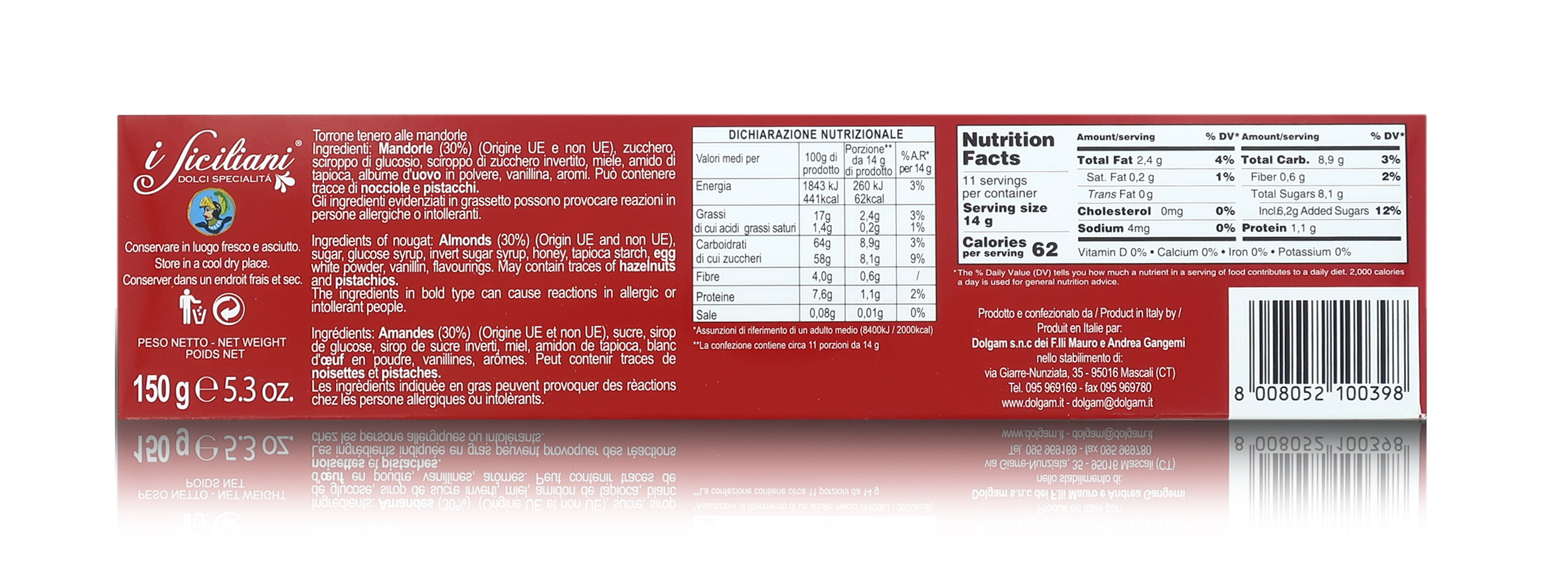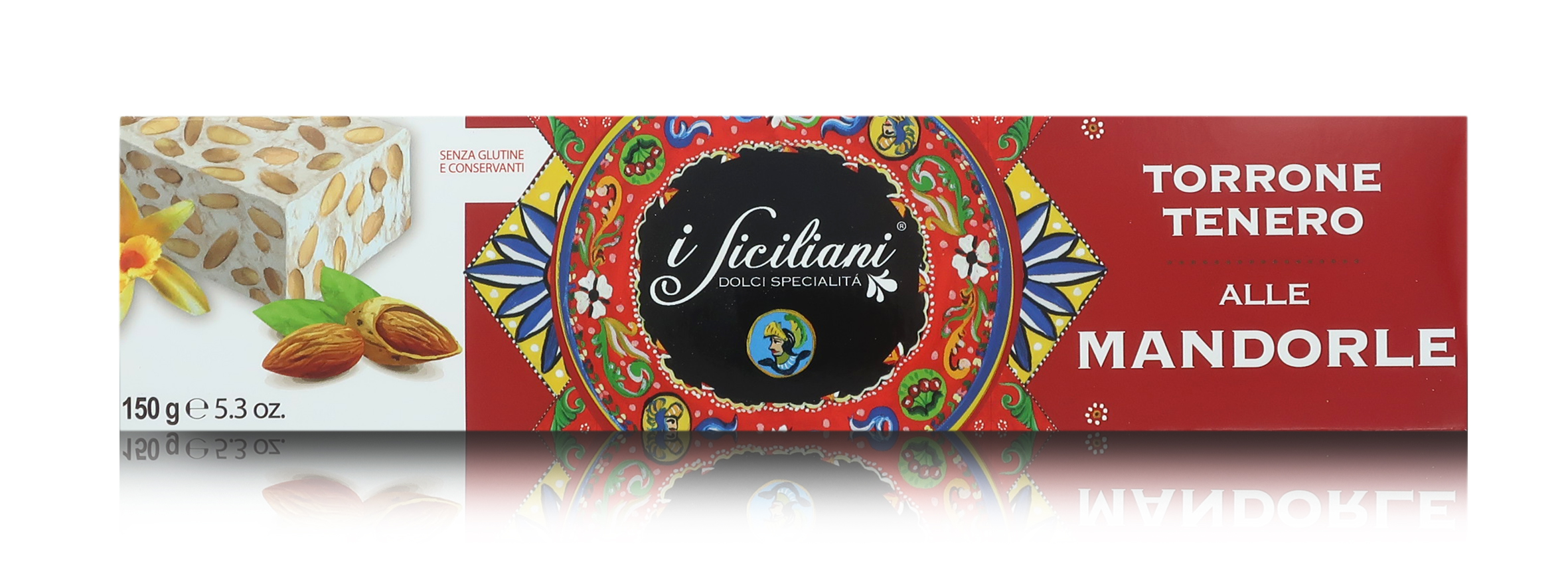 Torrone tenero alle mandorle realizzato in Italia, in astuccio di carta da 150g.