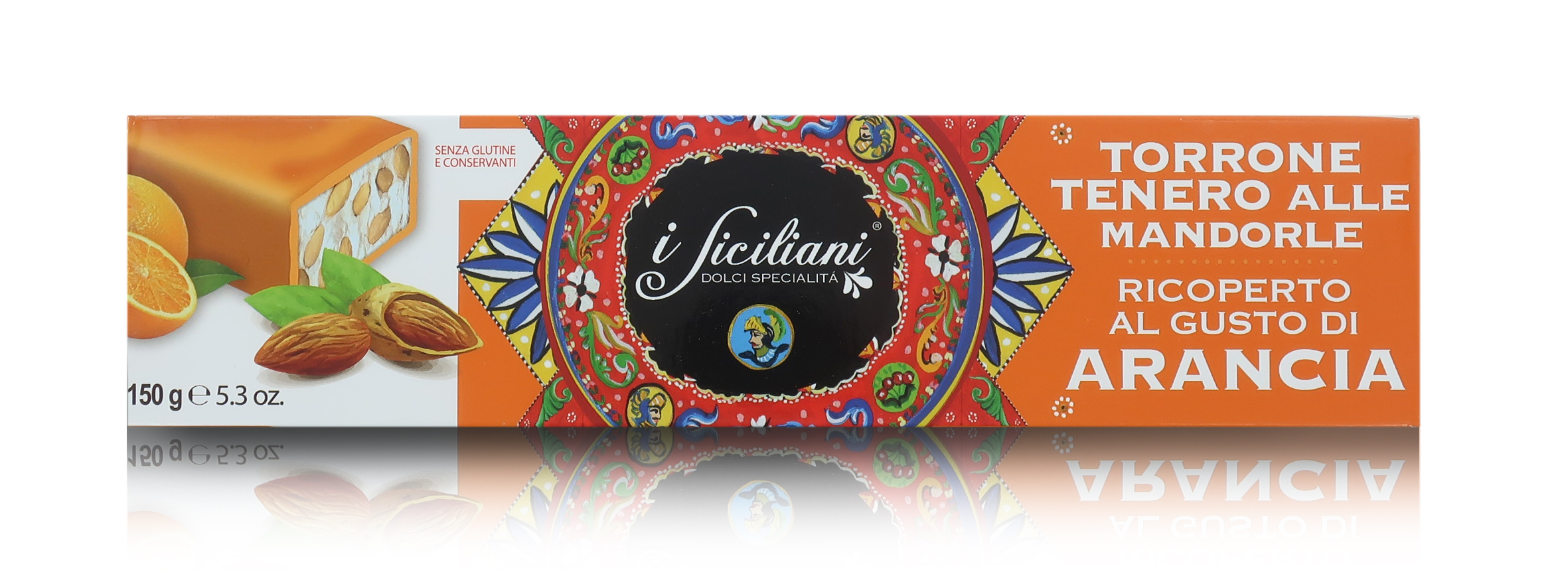 Torrone tenero alle mandorle al gusto arancia, realizzato in Italia, in astuccio di carta da 150g.