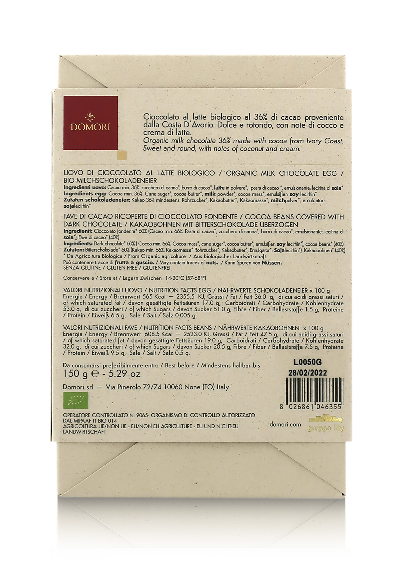 UOVA di cioccolato al latte al 36%, realizzato con cacao aromatico africano. All’interno una sorpresa Domori. Peso: 150 g. Dimensioni UOVA: 15 cm (A) x 9,5 cm (L).